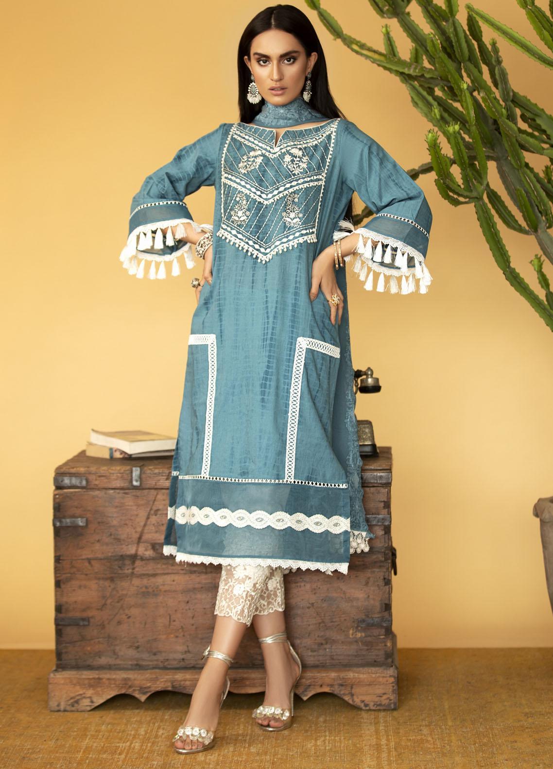 A Tie and Dye chalk blue canvas with unicorn white silk thread embroidery is worth a sight this season! The hints of mirror embroidery and contemporary pattern is traditional yet trendy, paired with an embroidered chiffon duppata and contrasting pants with delicate trims