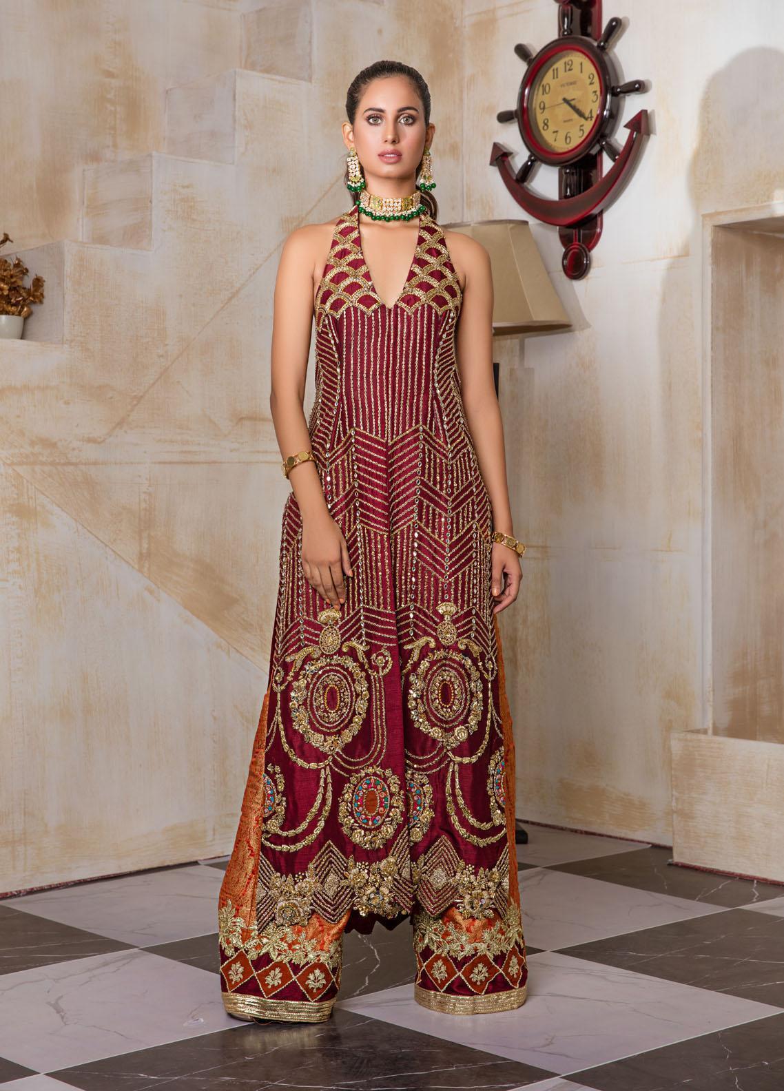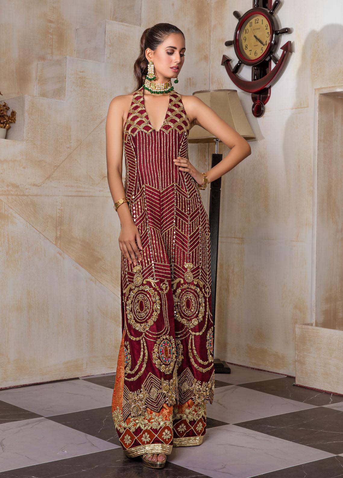 Dipped in dark red wine pallet, this front open halter shirt holds grace and demurity, the modern geometric pattern intricately embellished with zardozi and sheesha blending into floral bouquet with hints of multi reshamkari is breathing life into this modern attire, paired with atlas rust "azaar "with a contemporary pattern at hem completes the look with a poise