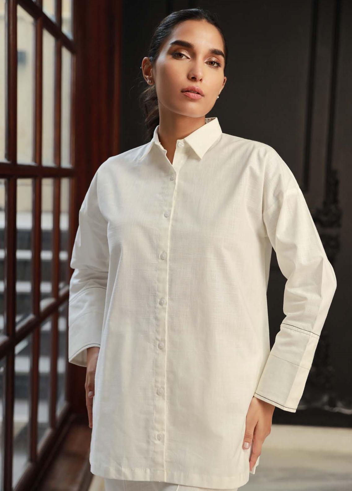 White colour basic co ord outfit Featuring a button down shirt spread collar stylized sleeves cuffs and paired with straight cut trousers A classic elegant outfit to style for semi formal and smart casual wear