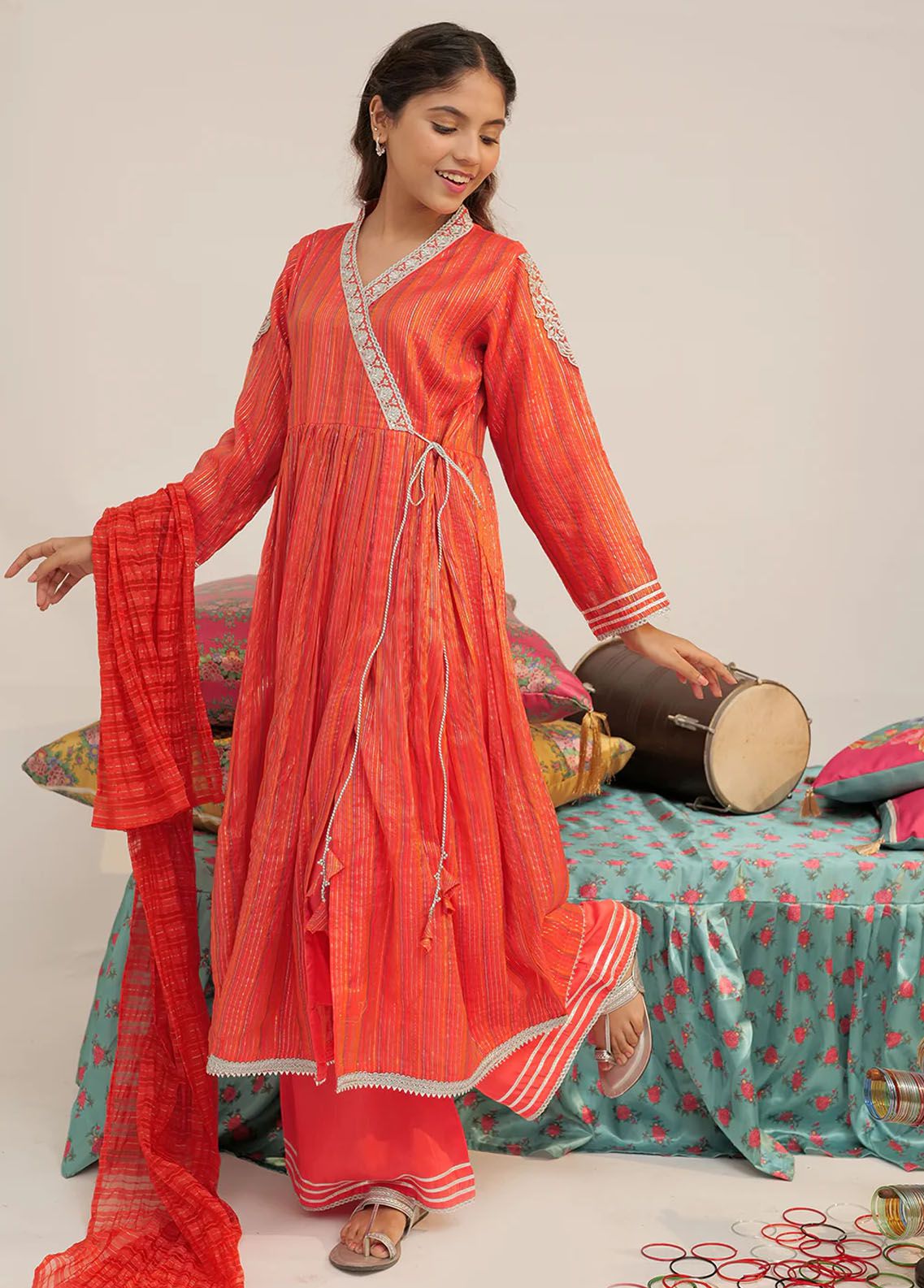 Angarkha style frock with fancy embroidery on shirt front and back Finished with fancy lace and dori Paired with wide pants and a dupatta br data mce fragment 1