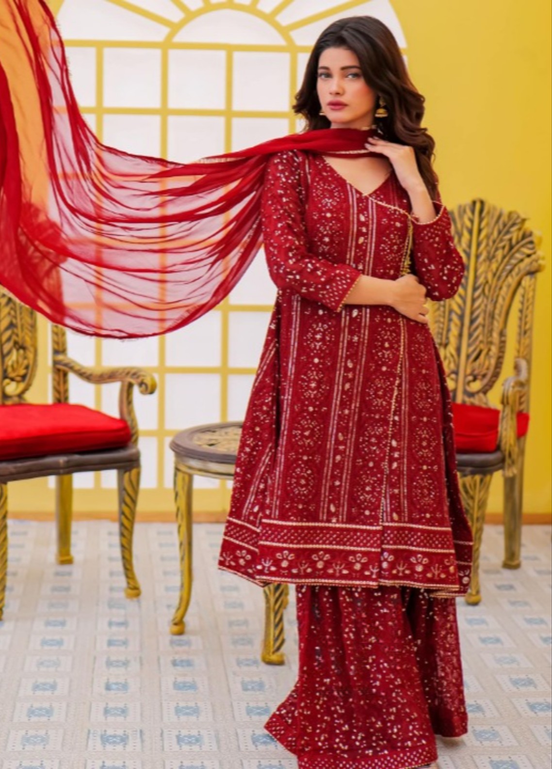An angrakha style shirt with a gharara is a traditional outfit featuring a knee-length or shorter shirt with an overlapping closure, often adorned with intricate embroidery or embellishments, paired with a flared, wide-legged pant called a gharara.