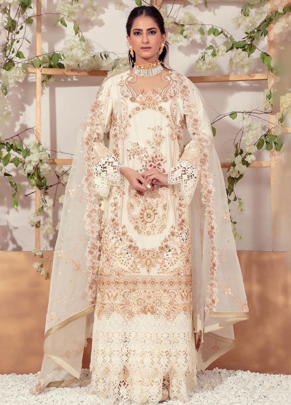 Classic straight silhouette that flows down from the shoulders without excessive waist shaping. This silhouette provides a clean and elegant canvas for showcasing the embroidery. Highquality silk fabric that complements the opulent nature of the gold and ivory embroidery. Silks smooth texture will enhance the overall look and feel of the garment. Beautiful zardozi work is done to enhance the texture and luxurious feel of the embroidery. Intricate lace work done on the shirt and pant border. The shirt is paired with beautiful embroidered organza dupatta. Pants can be added seprately.