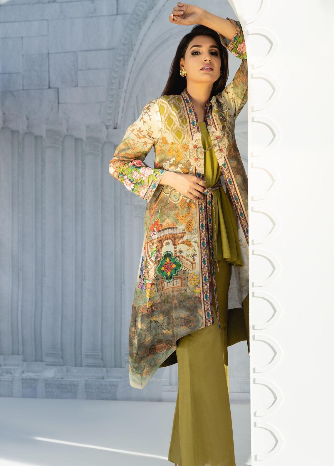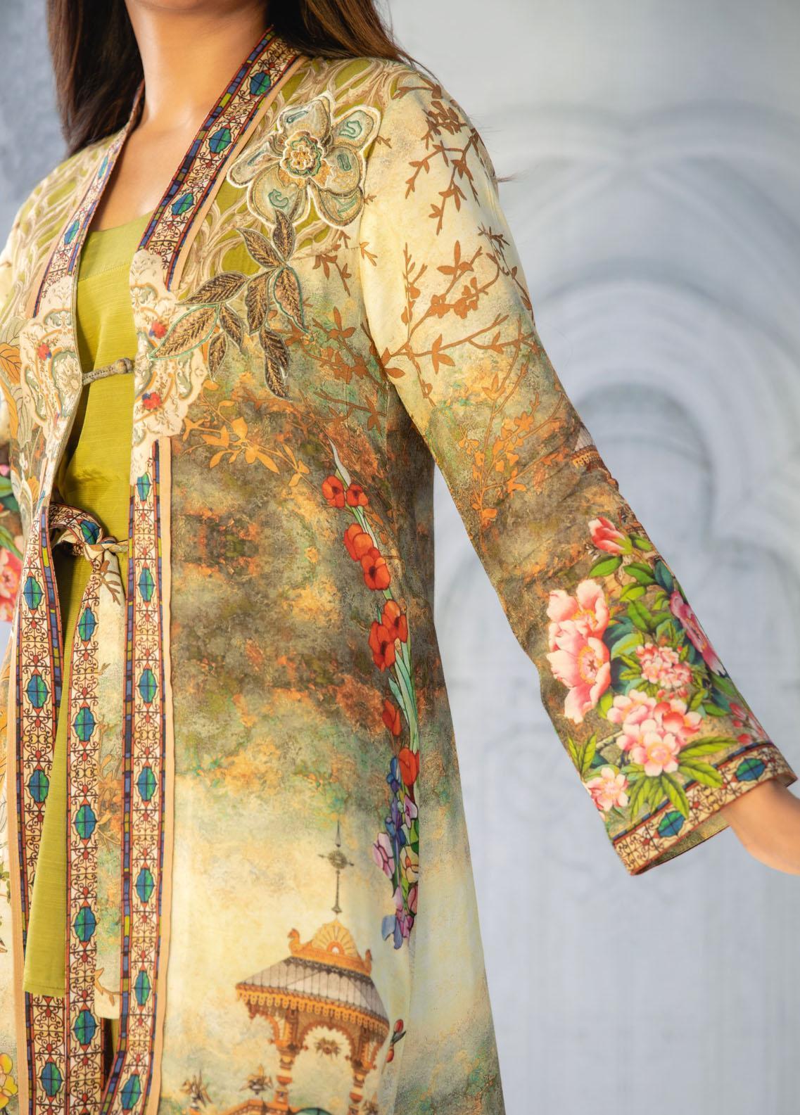 Digital printed cotton silk canvas inspired by French era, with hint of olive green and pop up colours. Applique work enhanced the over all look of the outfit. The overcoat comes with slip and can be paired with pants as shown in the picture. Best for summer wear, collage wear, brunches and hi-teas.