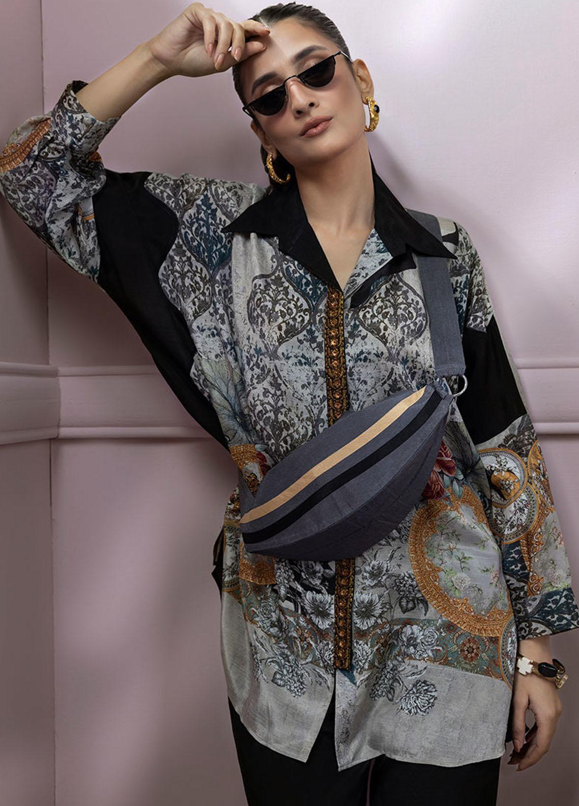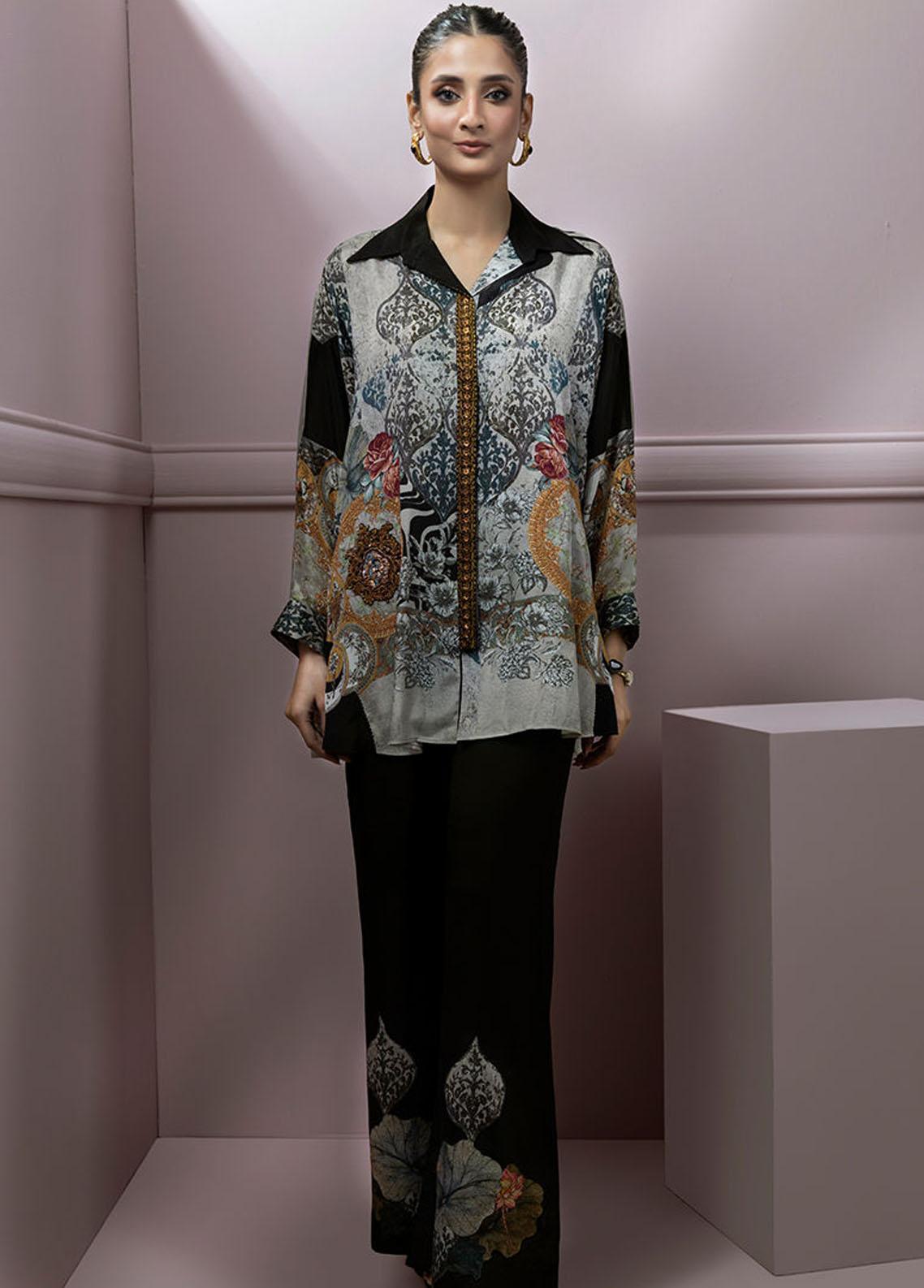 V-neck buckle shirt styled with printed pants. Shirt has detailed thread floral embroidery on centre of shirt with zari hint. Looks best for an official events, evening parties, local and international wear. Bag can be added seperately as per customer request.