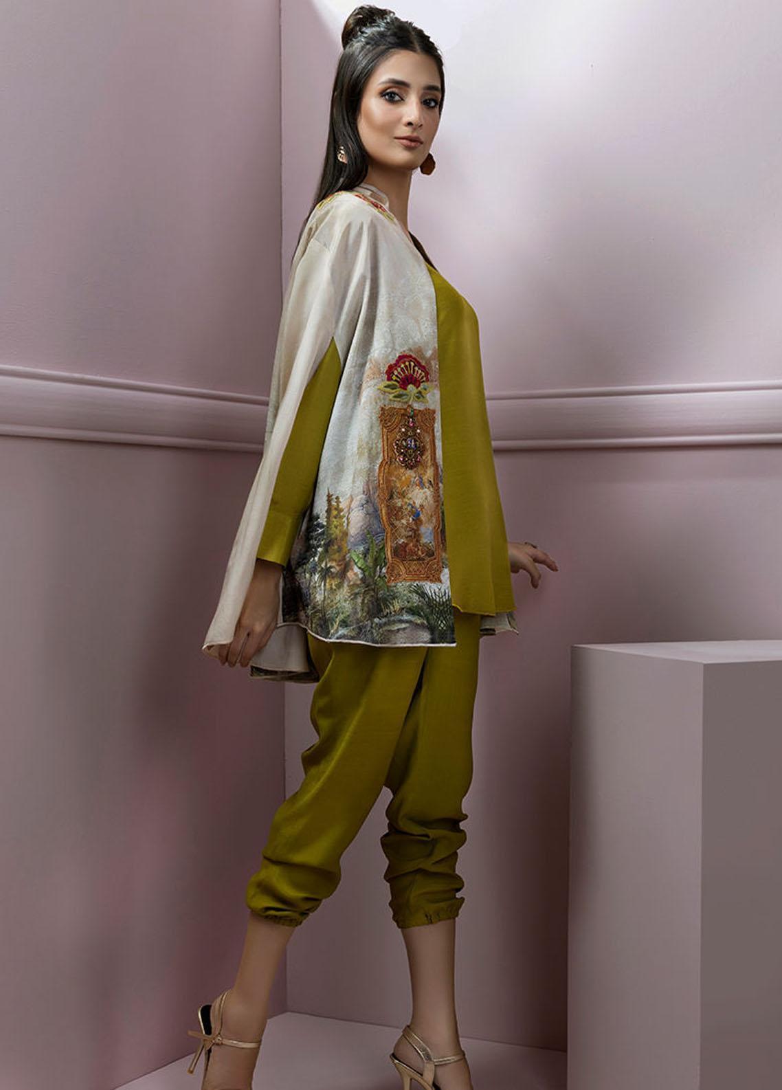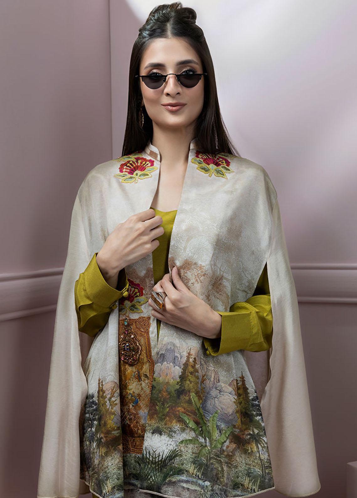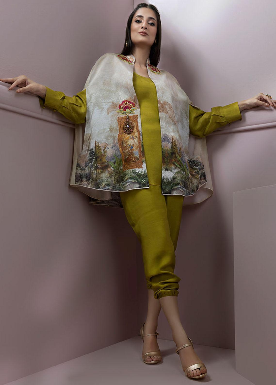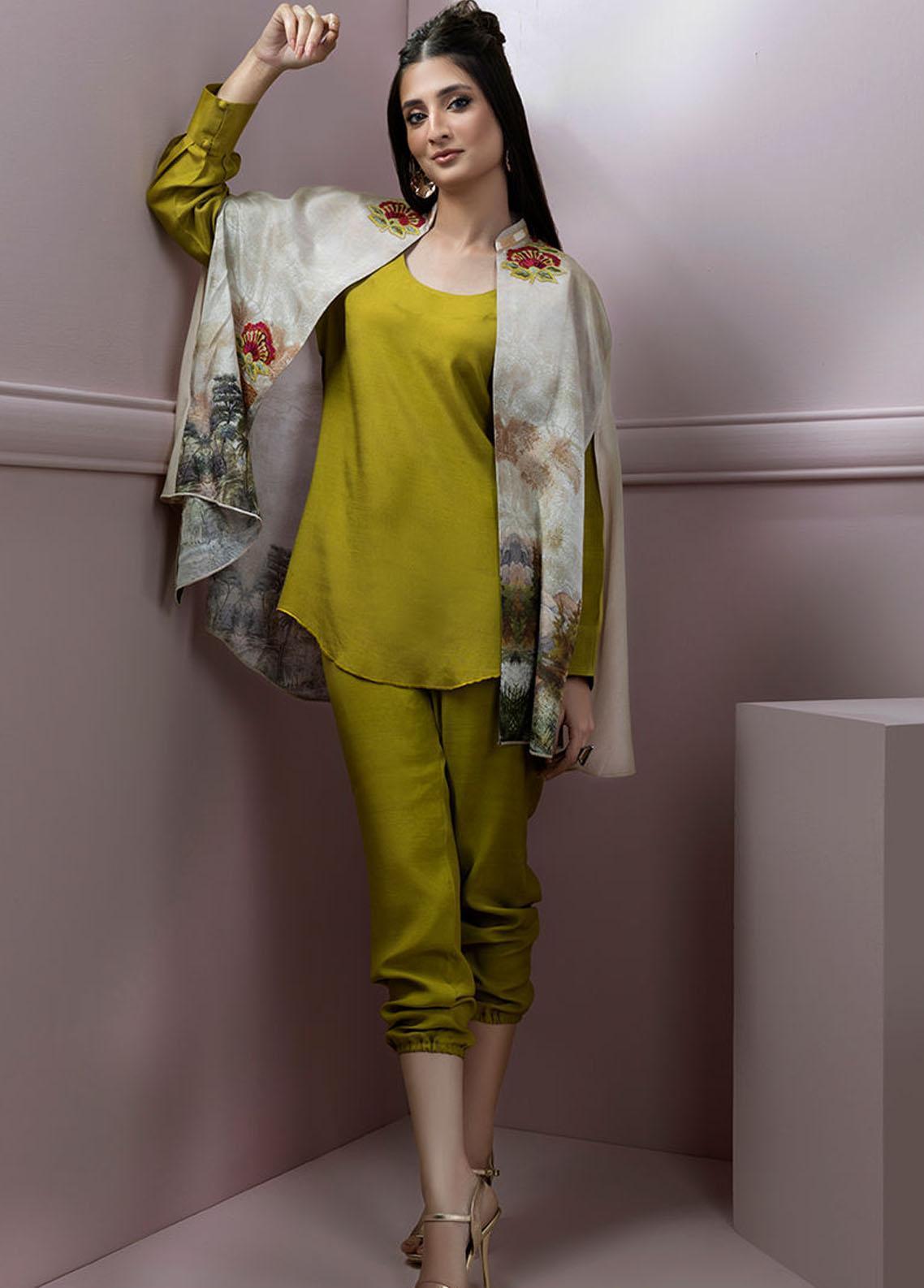 Artistically done tropical inpired canvas in this trendy cut jacket. Touch of hues of embroidery in red and antique gold on the front. This set comes with solid inner and pants. Looks best for lunches, kitty parties, evening parties and local and international wear.