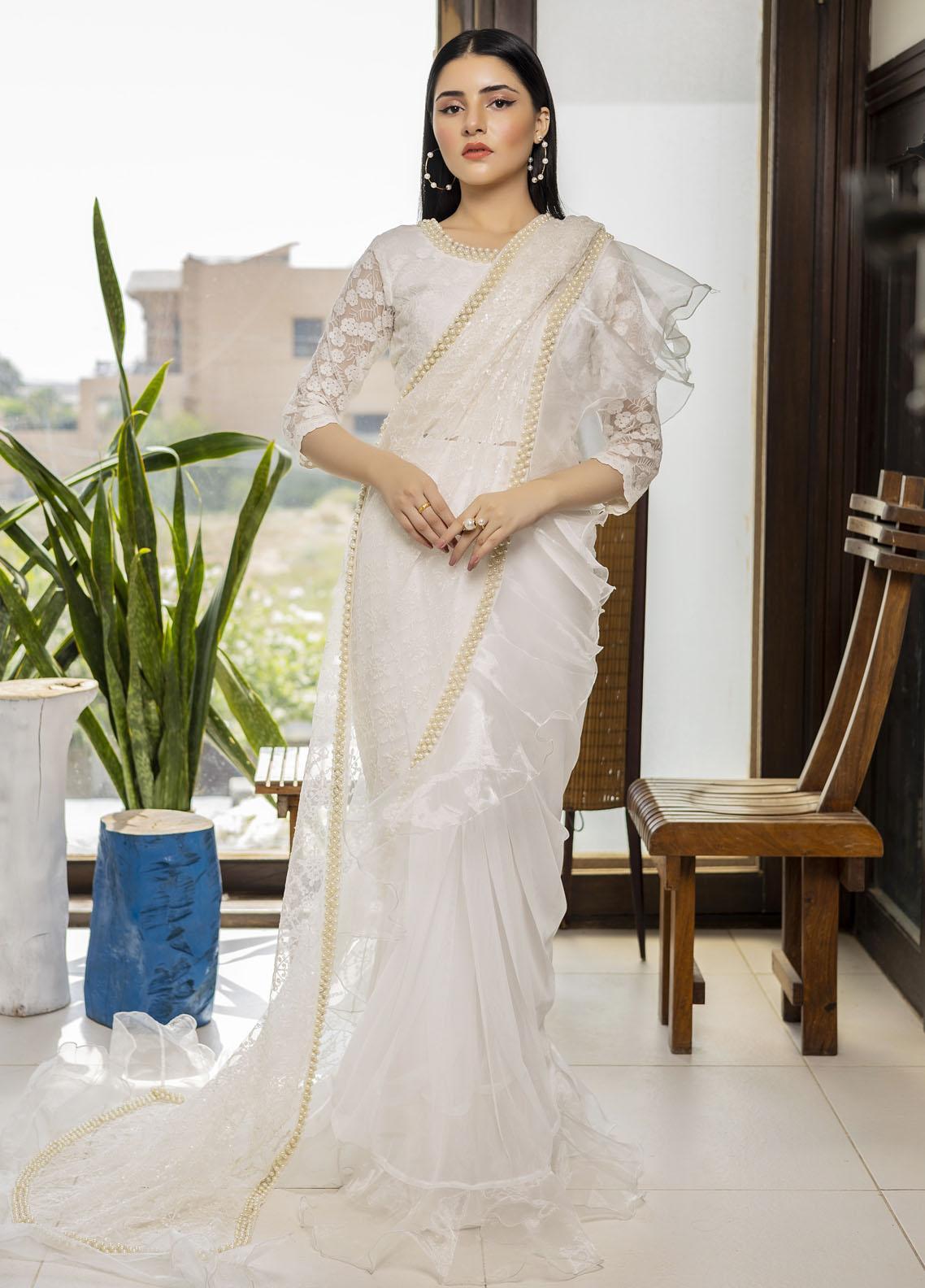 A white, net saari featuring finiest thread embroidery and glimmering sequins spray.
