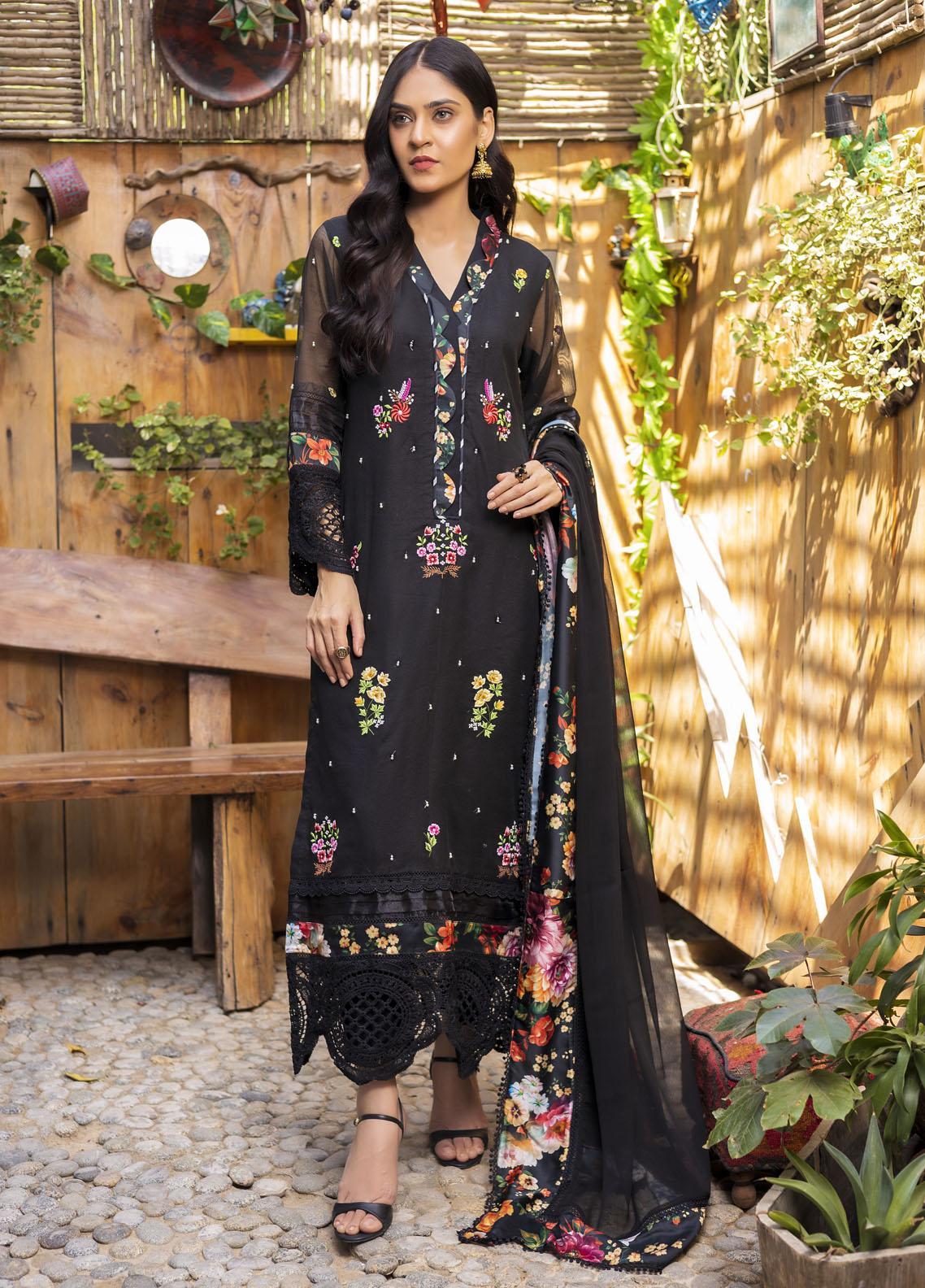 Black - Absorbent shade - deep and always bring its own uniqueness. Cotton Khadi fabric with thread embroidered floral pattern motifs - hand pearl sprayed shirt - lace daman and Embroidered Sleeves. Finished with floral digital printed silk fabric and paired with chiffon dupata.Completing the look with crepe trouser pant.