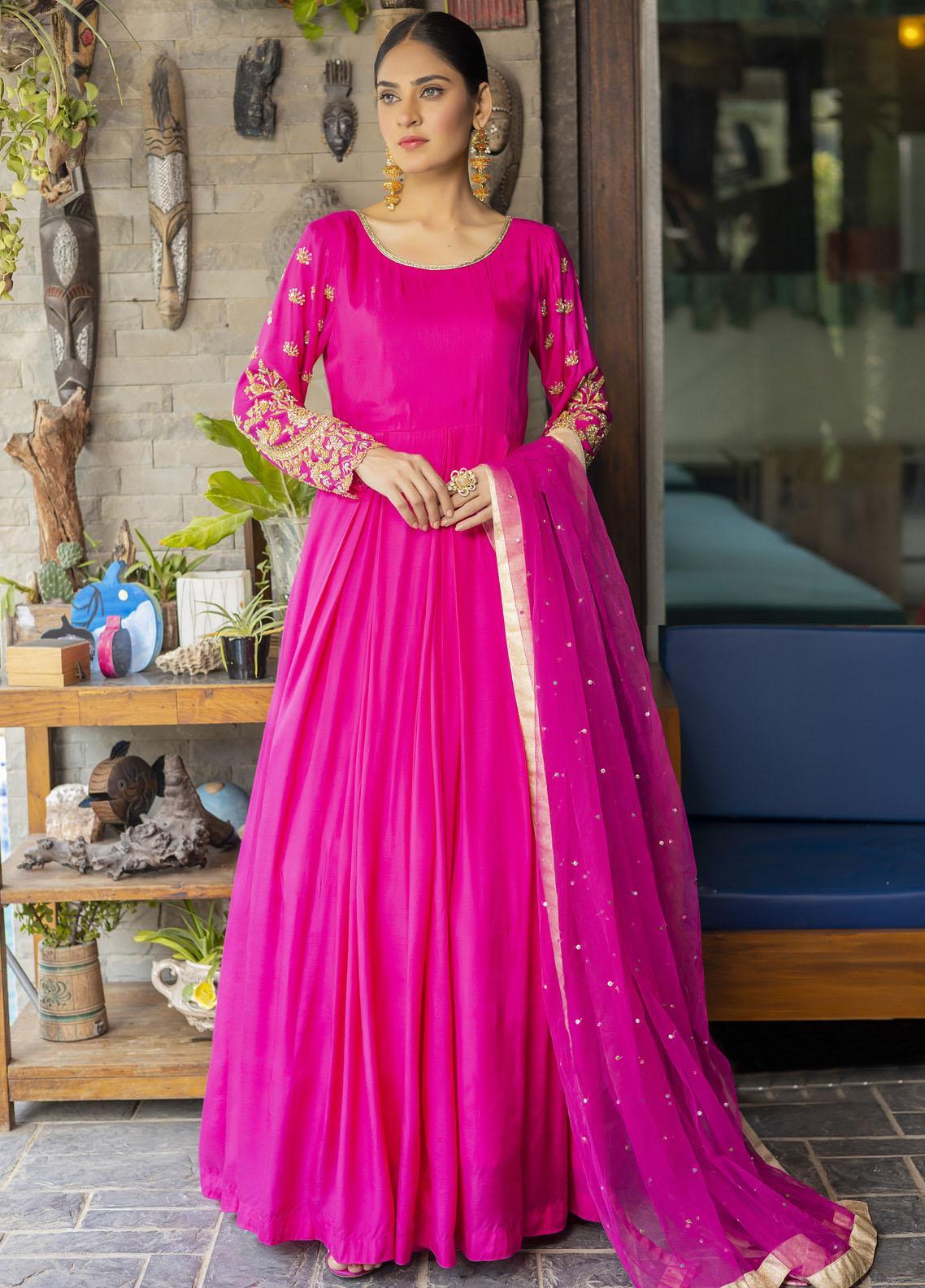 The hot pink raw silk pishwas, embroidered with intricate hand details, is a ravishing sight for the onlooker. One cant help but admire this jaw dropping piece.