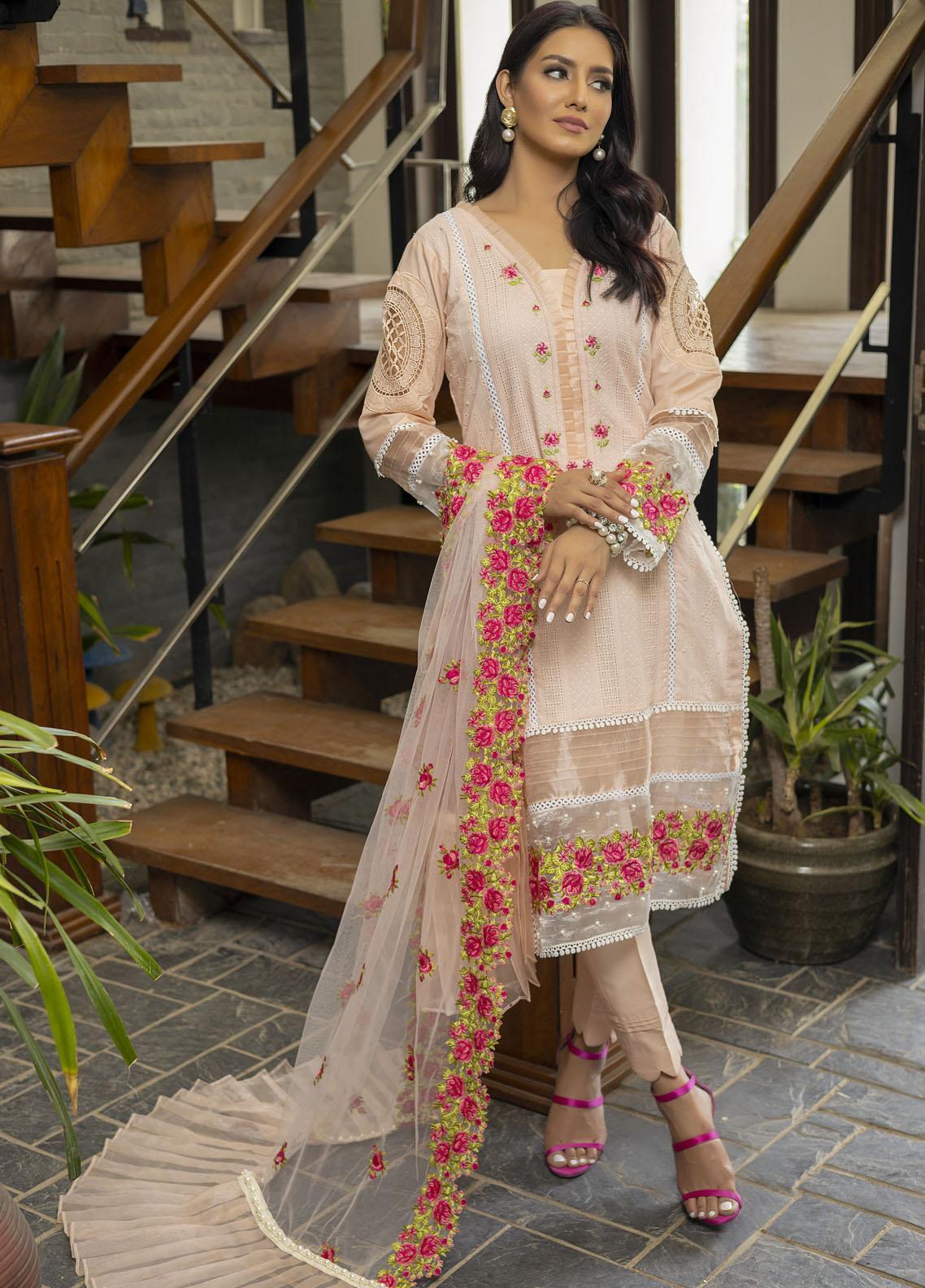 Floral and Pinks are an amalgamation for a life-time trend. Schiffli fabric with hand embroidered floral motifs - styled up with lace border on daman and Sleeves.Paired with embroidered net dupatta finished with pearl lace and fril finishing. Completing the look with dyed cotton lawn trouser.