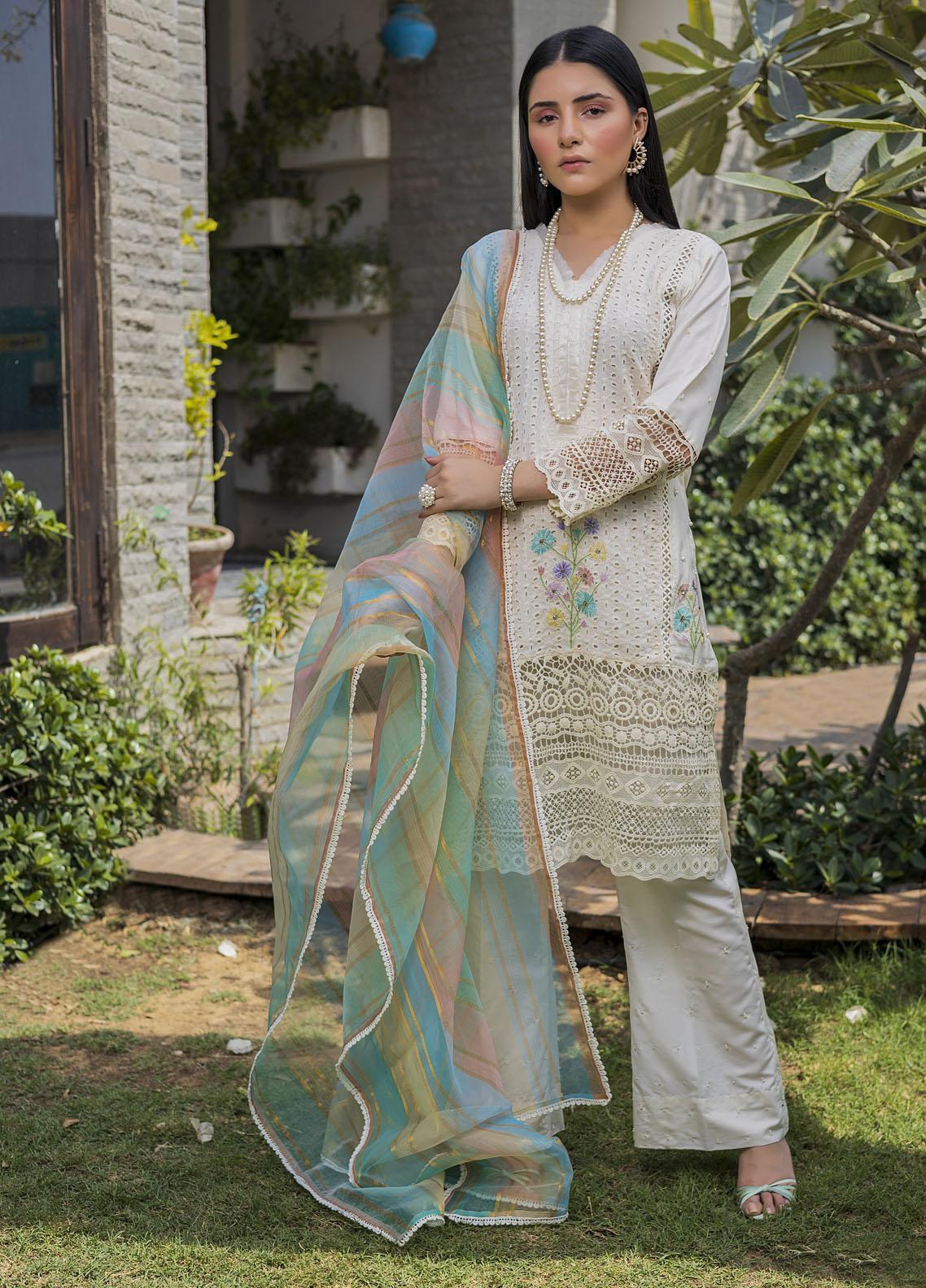 Pure off white color - with the pastel contrast. Schiffli fabric front cotton lawn pintexed back with hand pearl sprayed - lace daman and sleeves border. Paired with cotton organza khadi dupata.Paired with base color cotton lawn pants.
