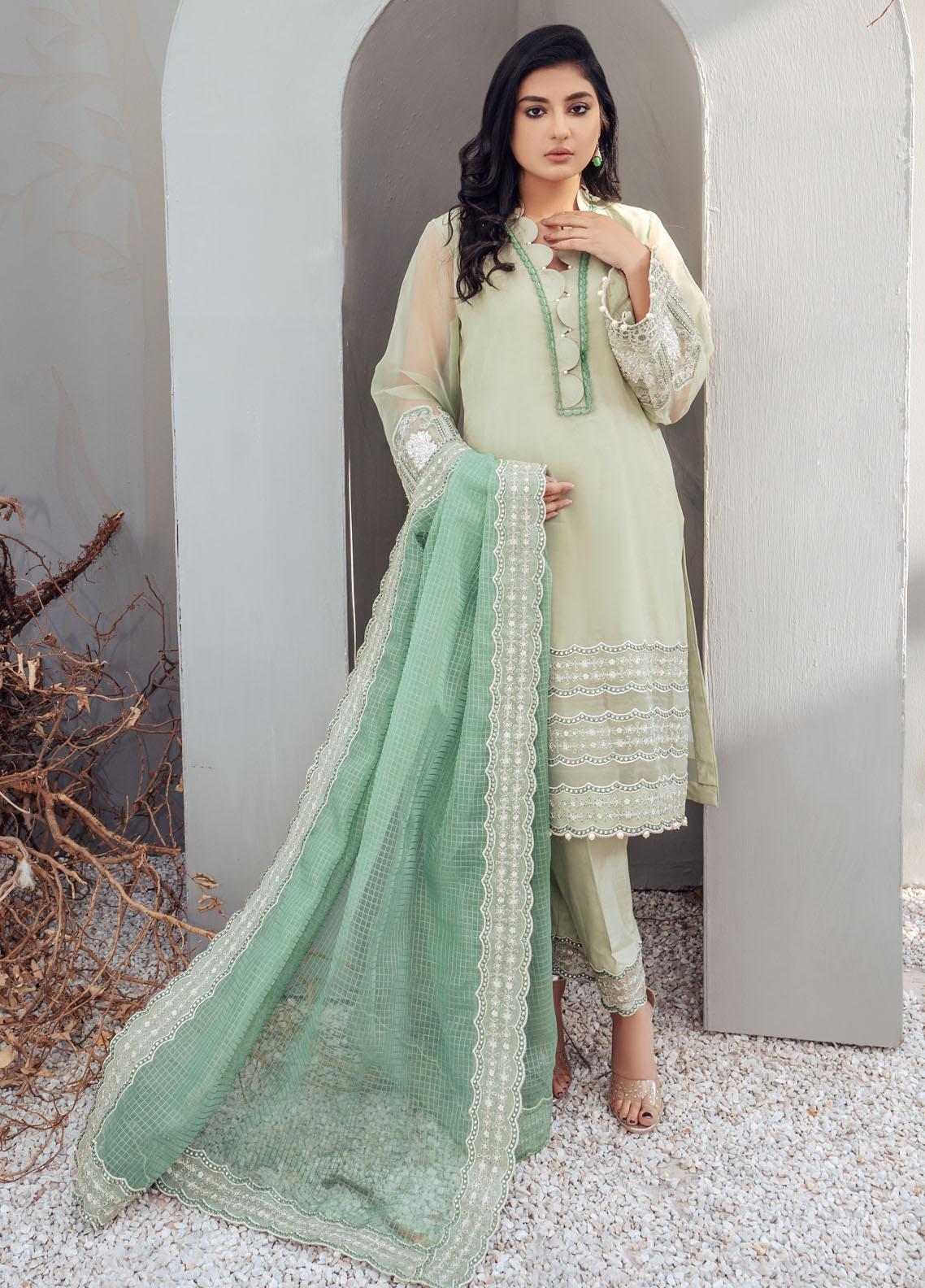 Make a statement in this organza shirt with fine embroidered lace detailing - paired with matching raw silk straight embroidered bottom with embroidered organza dupatta