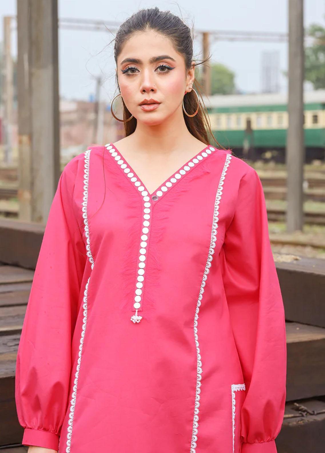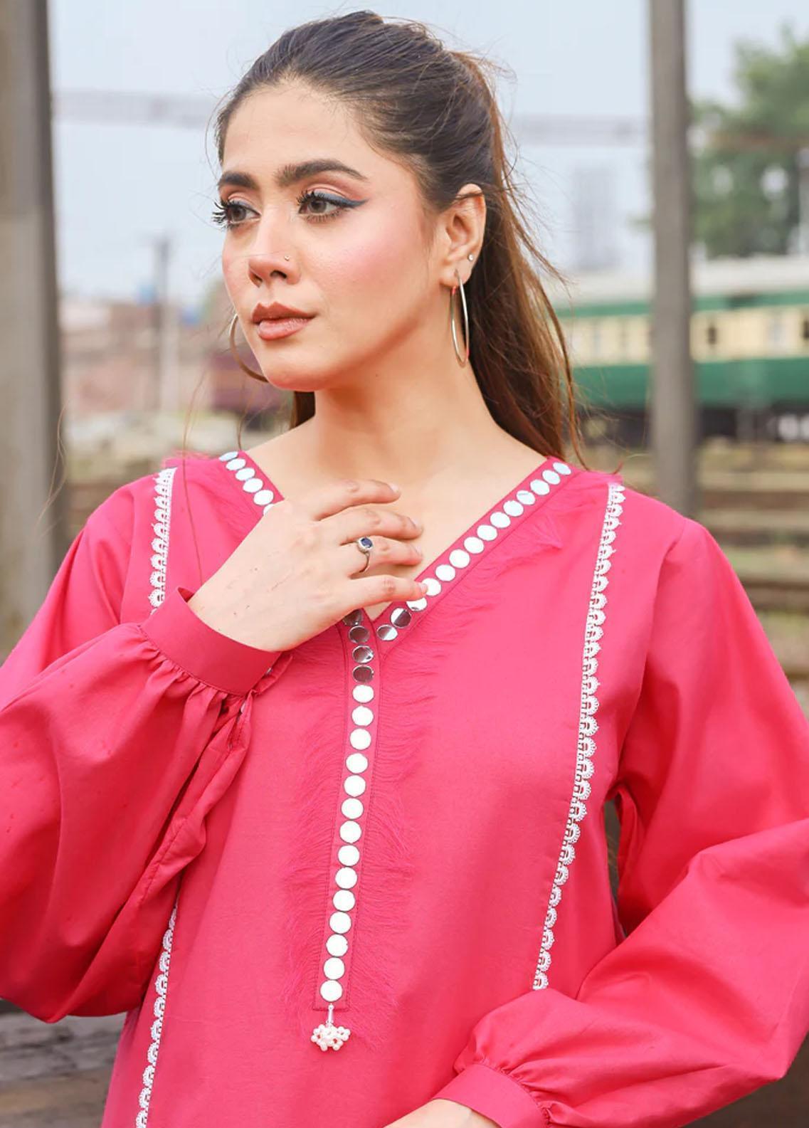 The Hot Pink Dress Is A Vibrant And Eye-Catching Ensemble. It Is Beautifully Embellished With Lace, Crystal Hangings, And Mirror Work,E Creating A Stunning Visual Display. The Overlap Neckline, Cuff Sleeves, And Straight Trouser Showcase Intricate Detailing, Adding A Touch Of Elegance And Sophistication To The Overall Design.