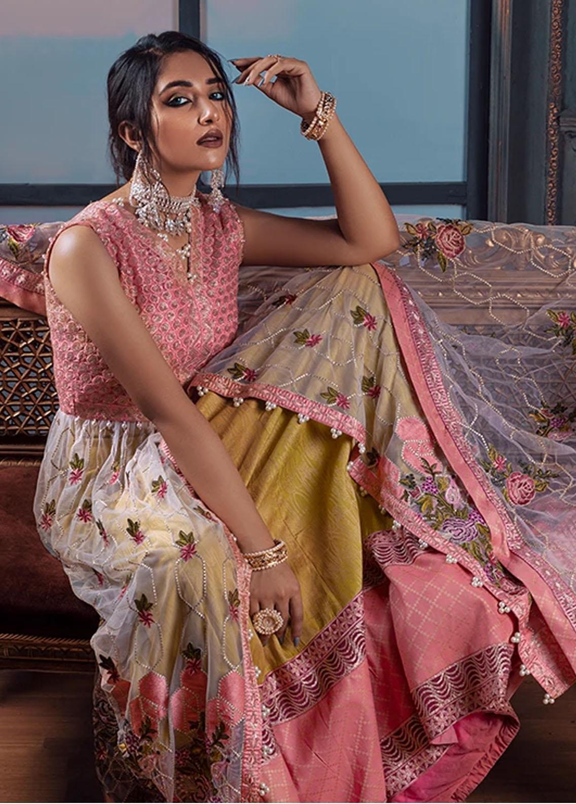 EMBROIDERED NET SEQUENCE BODIES FRONT AND BACK, EMBROIDERED NET SEQUENCE SLEEVES, EMBROIDERED NET SKIRT,WITH EMBROIDERED BORDERES, PK KATTAN FROCK INNER, JAQUARED LEHNGA EMBALISHED WITH EMBROIDERED BORDERES
