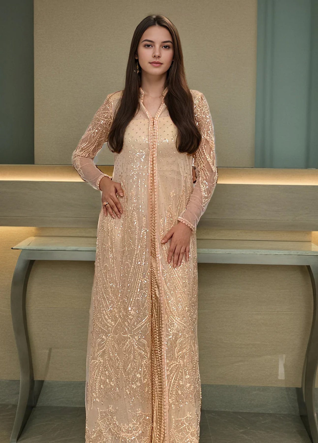 Indulge in luxury with our Net embroidered jacket featuring exquisite applique embroidery on the sleeves, daman, and back with scallop details on daman. The jacket is meticulously embellished with sequins, tiki stones, pearls, cut glass beads, and tassels, adding a touch of opulence to your ensemble. Complete the look by pairing it with the tube top and crushed gharara for a sophisticated and stylish outfit.