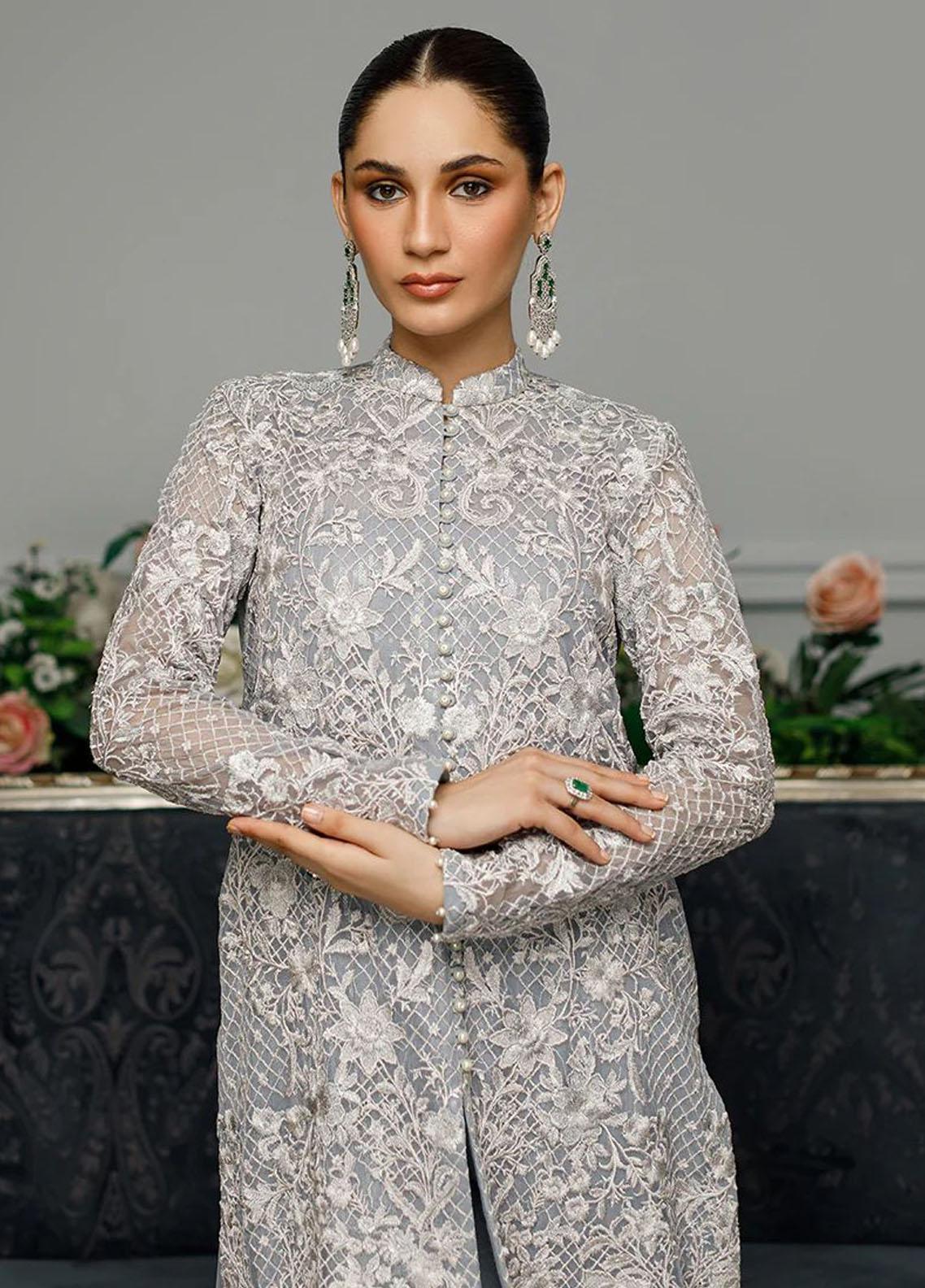 You ll love our Greyish Blue Front Open Dress It comes with a mesmerizing net embroidery and is highlighted with subtle grayish blue tones We ve adorned the dress with intricate floral patterns using advanced threadwork and beautiful silver zaree Get ready to be the star of every evening with the flashy loopy buttons and pearl edgings that further beautify the dress And the final touch We ve added sequins underneath that provide a glimmering charm This dress is your perfect companion for a captivating entrance Consider this Net Embroidered Dress