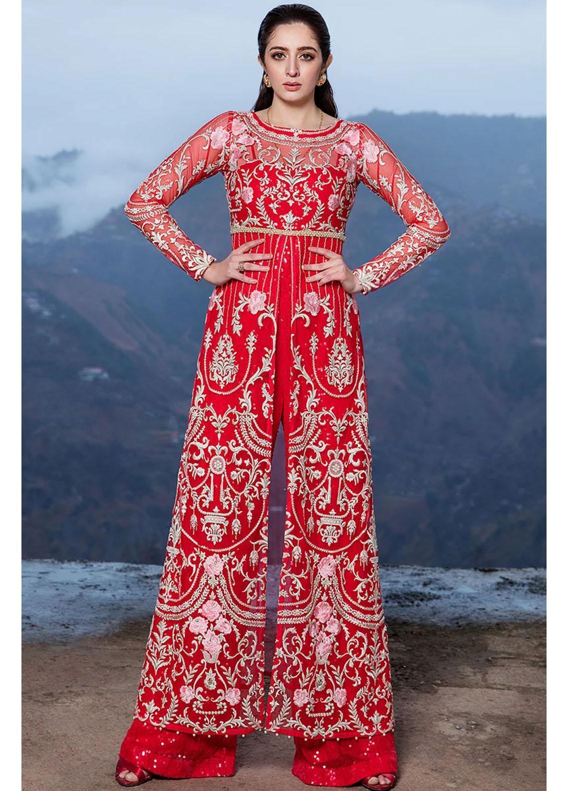 Stitched fully embroidered dress with jumpsuit inside and pearl embellished belt on waist.