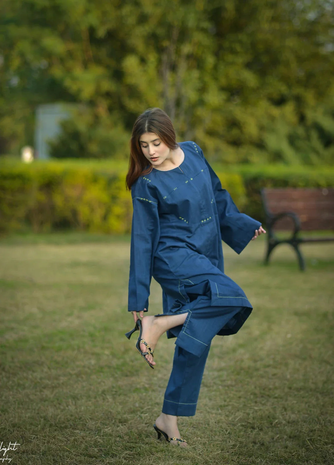 Description: Matching denim blue cotton trousers with a straight fit for everyday comfort and effortless style.