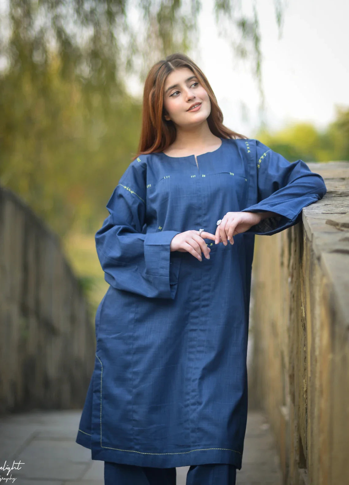Description: Minimalist cotton top in denim blue featuring loose full sleeves, a round neckline, and subtle embroidery detailing for a casual chic look.