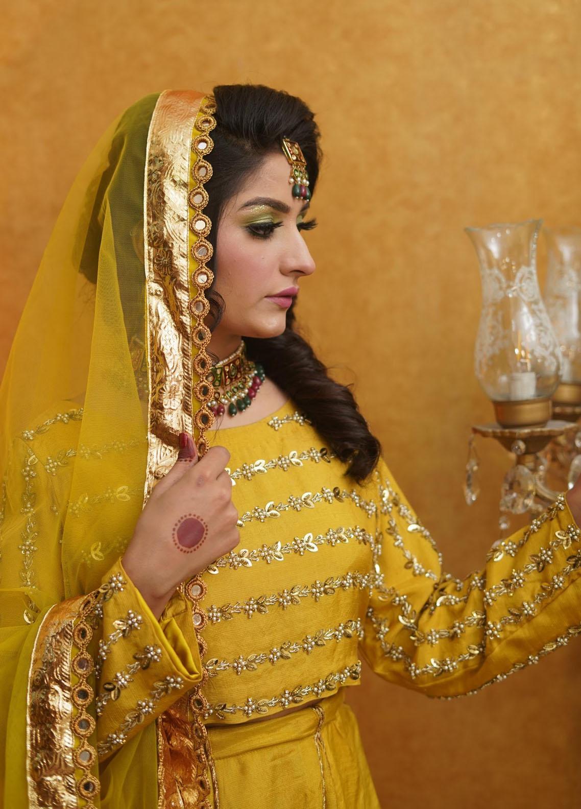 A stand out look for joyous occasions, this ensemble consists of a deep yellow hued lehenga choli.