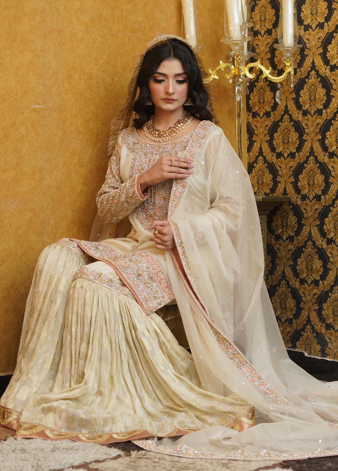 Details from our bold and regal ensemble Arzoo a organza shirt, Layered over an banarasi chiffon gharara with sprawling hand crafted embellishments.