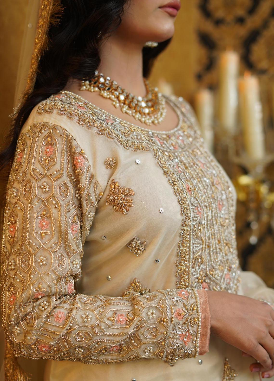 An opulent statement design is paired with an accent color dupatta, the perfect hue of peach detailing.