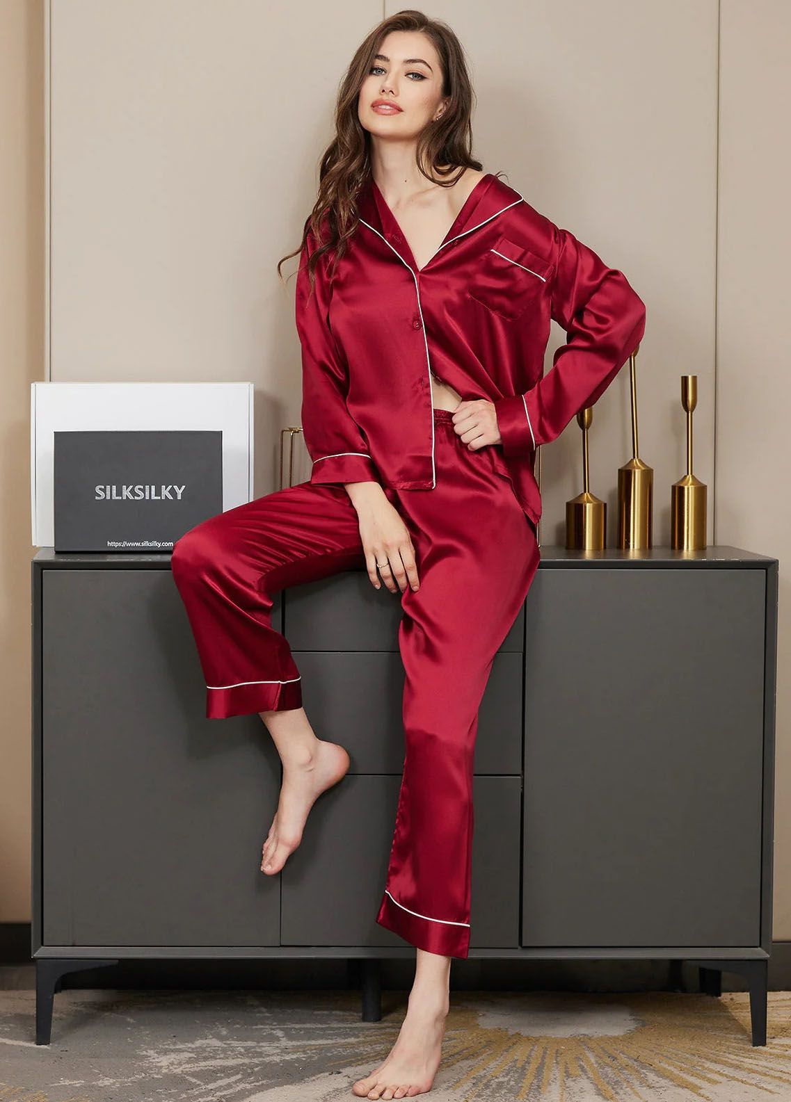Silk pajama set is made of silk Satin which is known for its softness comfort and breathability The flowing fit is perfect for lounging at home or sleeping