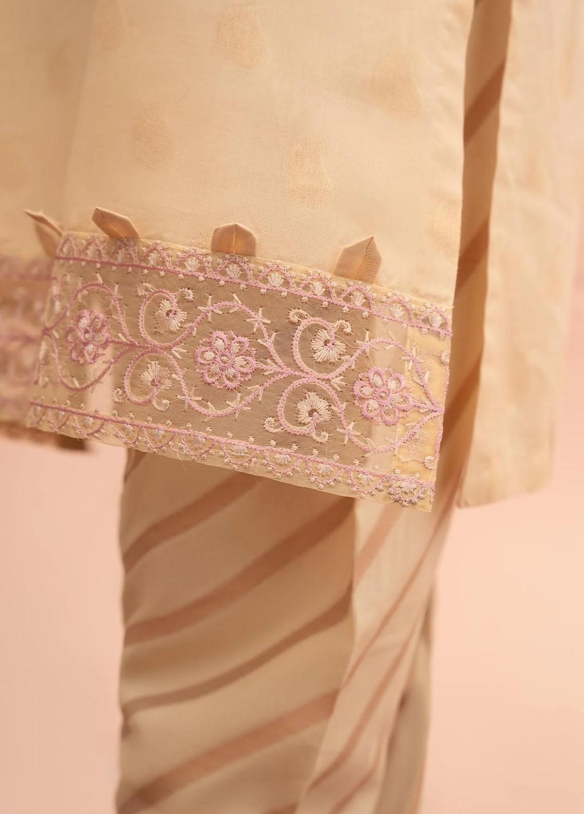 A Woven Base With Exquisite Embroideries And Cutomised Hand Embellished Button Details Is Ambued With Both Ease And Elegance. Stripped Rhythmic Patterns In Zipper Shalwar Pants Interprets Pastel And Vibrant Hues.