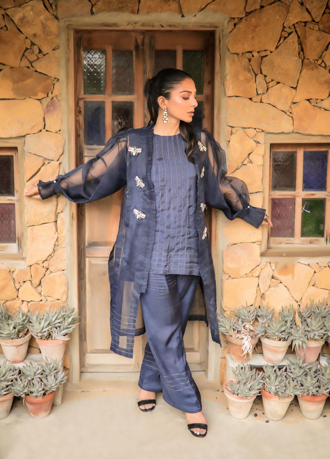 Beautiful Organza And Cotton Silk Dress Perfect For An Evening Event Pure Organza Coat With Pleated Front And Tilla Thread Work, Having Beautiful Embroidered Butterflies, Puffy Double-Cut Organza Sleeves With A Slit Cut At The Bottom Attached With Pearls, Plain Back With Thread Work At The Bottom, Cotton Silk Inner With Tilla Thread Work, Cotton Silk Trouser With Tilla Thread Work And Embroidered Butterfly Stitched 3 Pieces Inner, Trouser, Upper Coat Fabric Pure Organza, Cotton Silk Color Navy Blueactual Color May Vary From The Picture