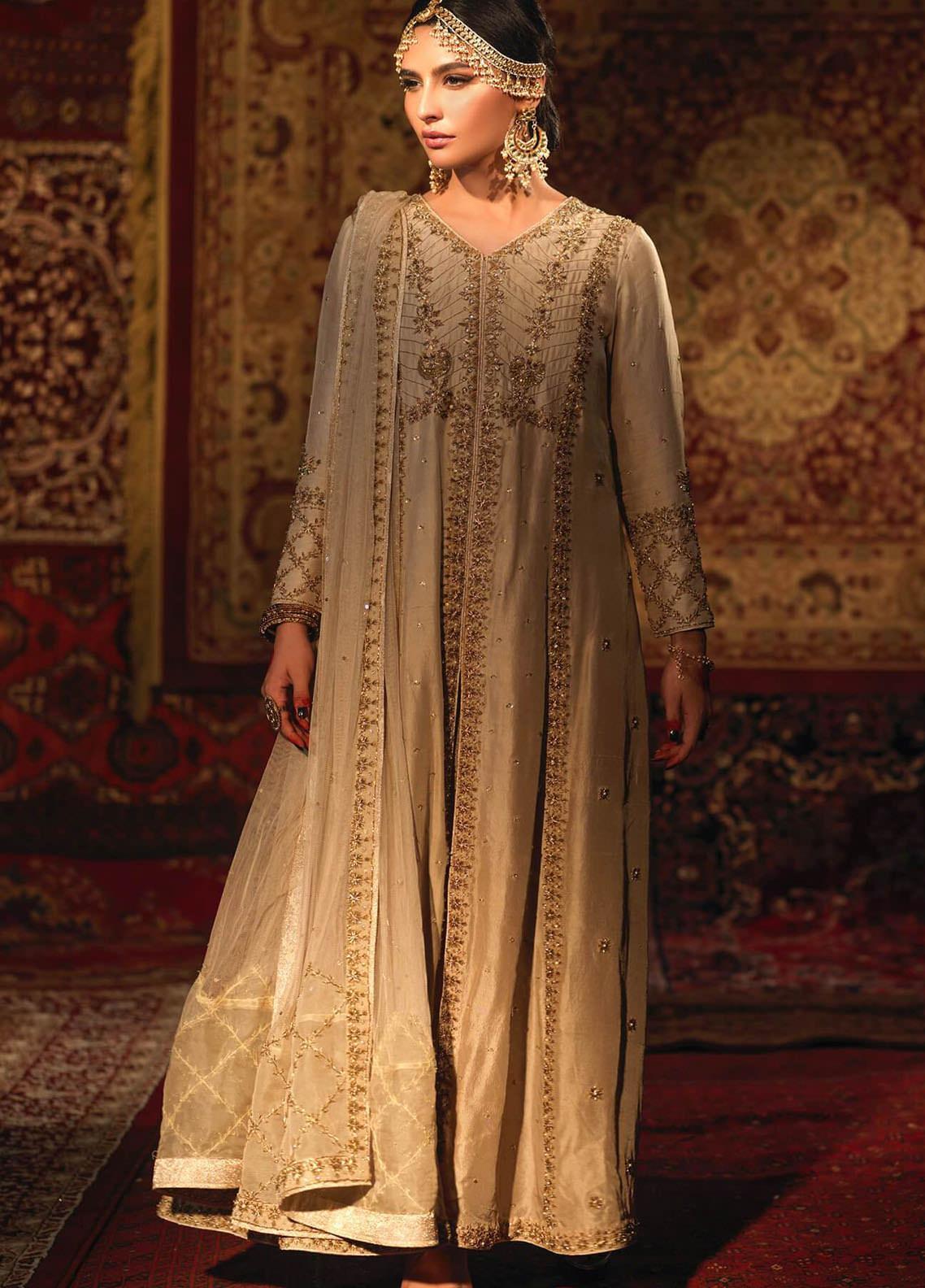 Shireen is a definition of grace and simplicity. This front-open pure raw silk ensemble in beige with its meticulously hand-crafted zardozi and resham work in accents of gold and copper enriches the grandeur of the garment. The intricate geometric and bird motifs on daman sleeves front and back gives a modish appeal to an already regal garment creating a perfect combination. It is paired with a net beige dupatta with hand embroidery on borders. The look is completed with banarsi beige straight pants which compliment the banarsi finishings on the dupatta and frock . A customised pouch can be made on order to complete the look