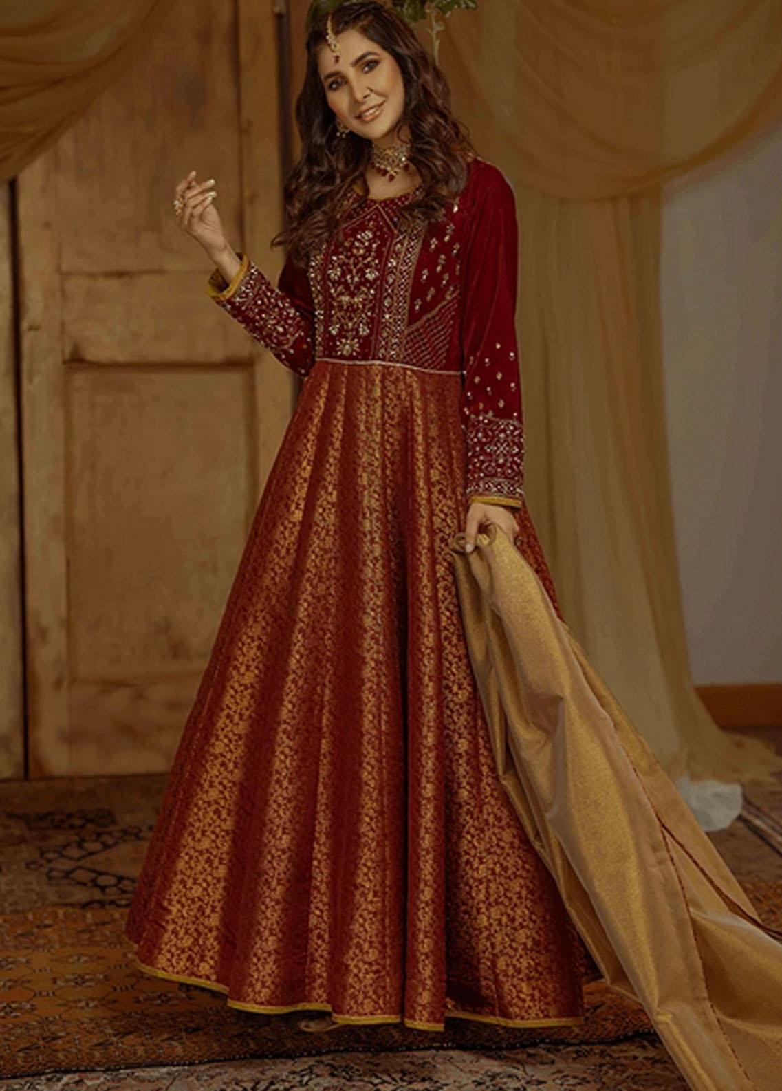Zaina is a stunning maroon velvet pishwas with a banarsi gehra in maroon and detailed intricately with kora dabka handwork and kingri and contrasting lime green finishings which makes this outfit a perfect wear for this festive season. It is paired with a gold tissue dupatta and finished with maroon banarsi