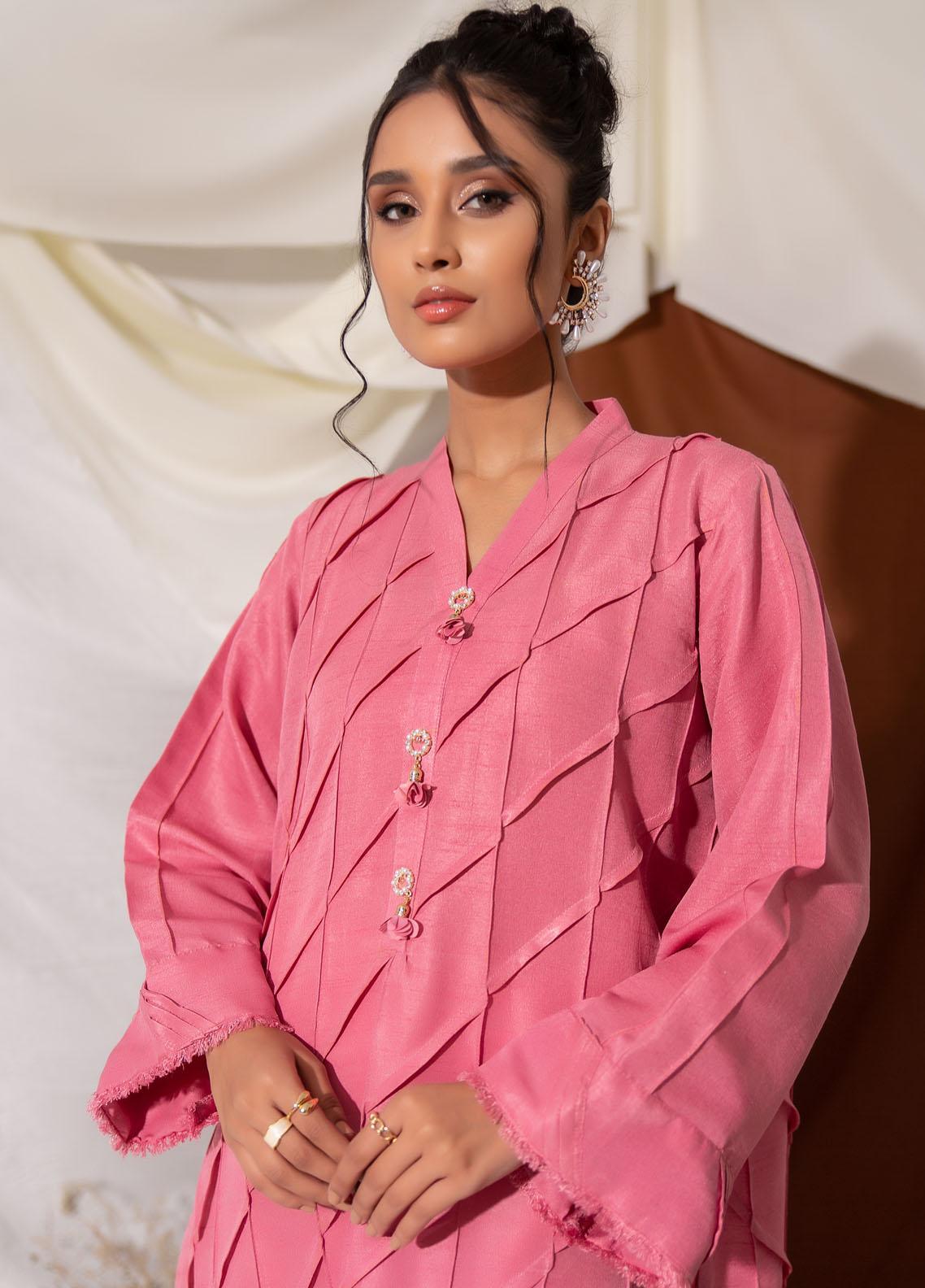Rosaline is a chic and classy raw silk kurti in blush pink with pleated texture in front and moderately on sleeves,