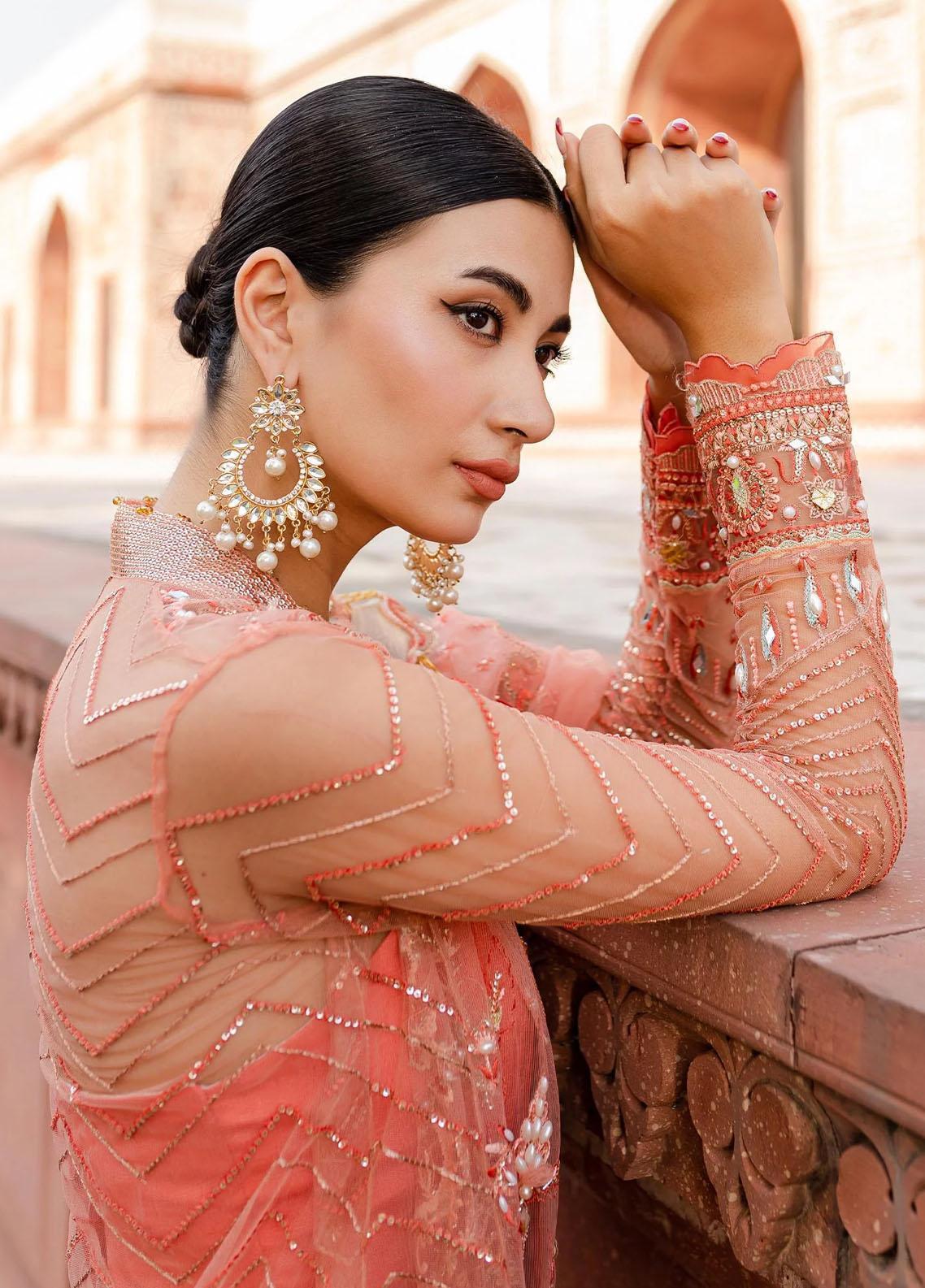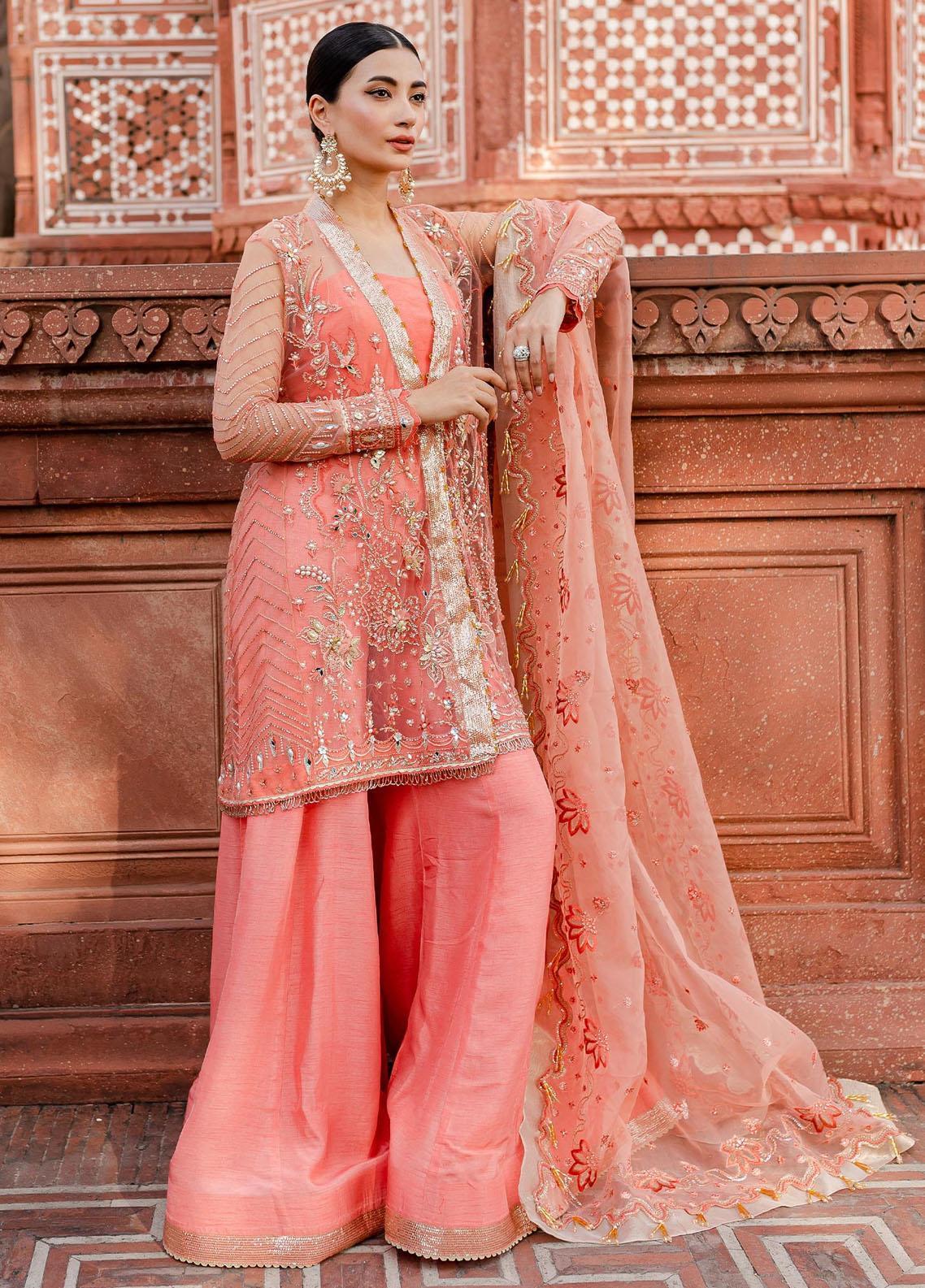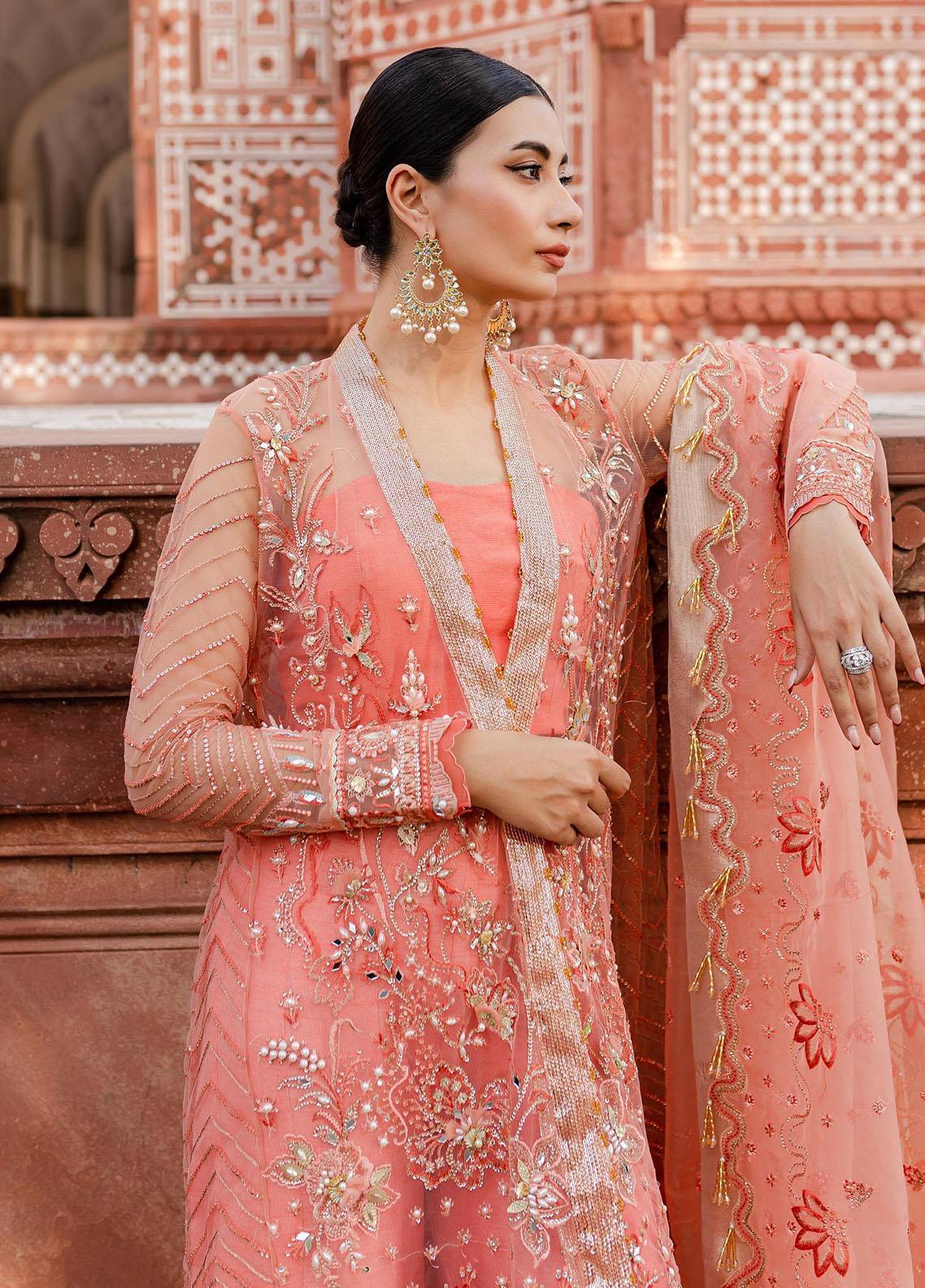 Bringing Elegance And Contemporary Style Together Ayra Features A Splendid Jacket On Pure Net Base With Embroidery And Breath Taking Hand Work Paired With A Similar Toned Rawsilk Azaar Pants And Undershirt The Organza Dupatta Is Crafted With A Mix Of Floral Peach Color Tones And Embellishments This Whole Look Is Curated To Uplift Your Formal Attire Elegantly