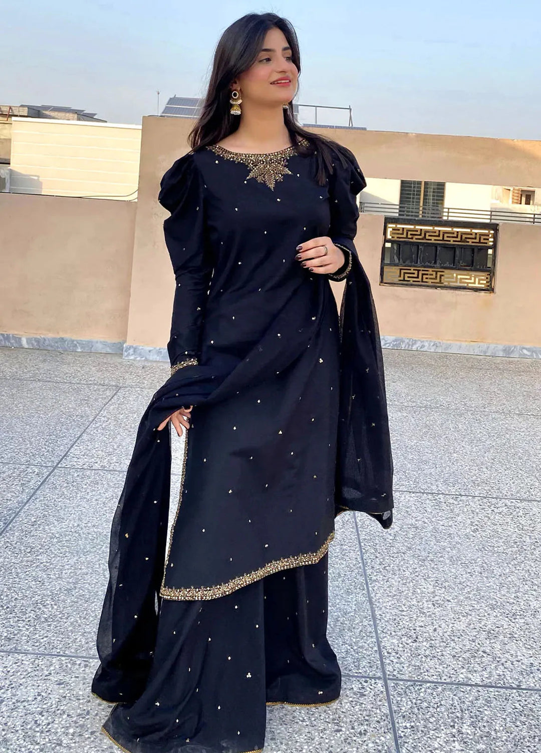 Silkspire by Fozia Khalid Pret Embroidered Raw Silk 3 piece Suit Noir
