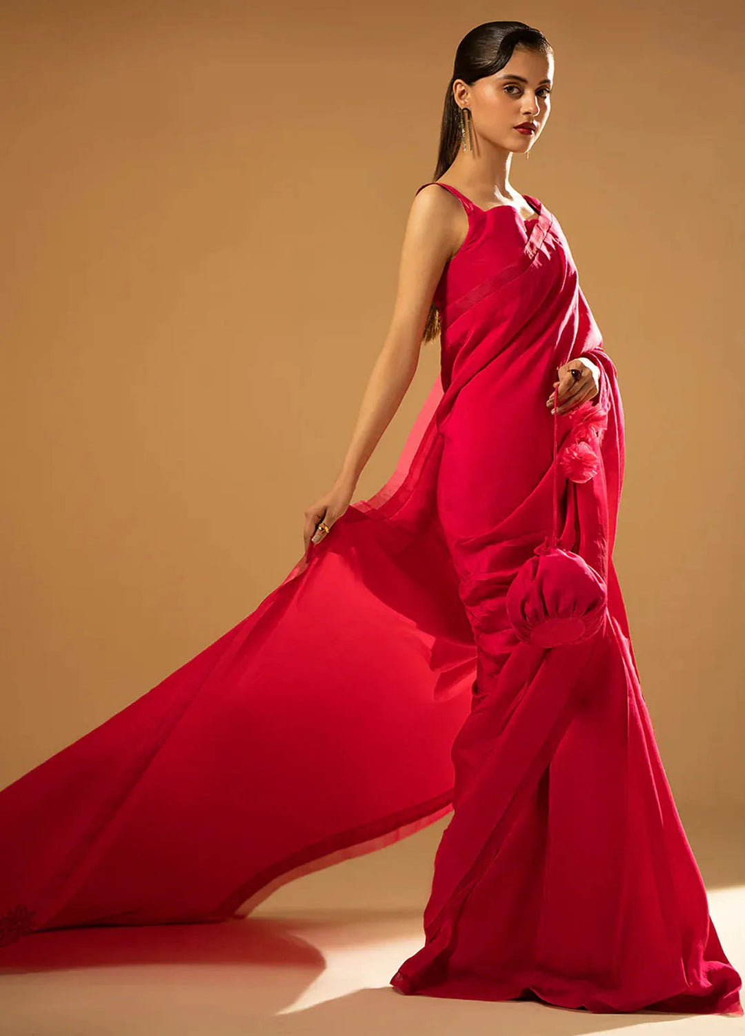 Fozia Khalid Pret Embroidered Raw Silk Saree Fuchsia Finesse