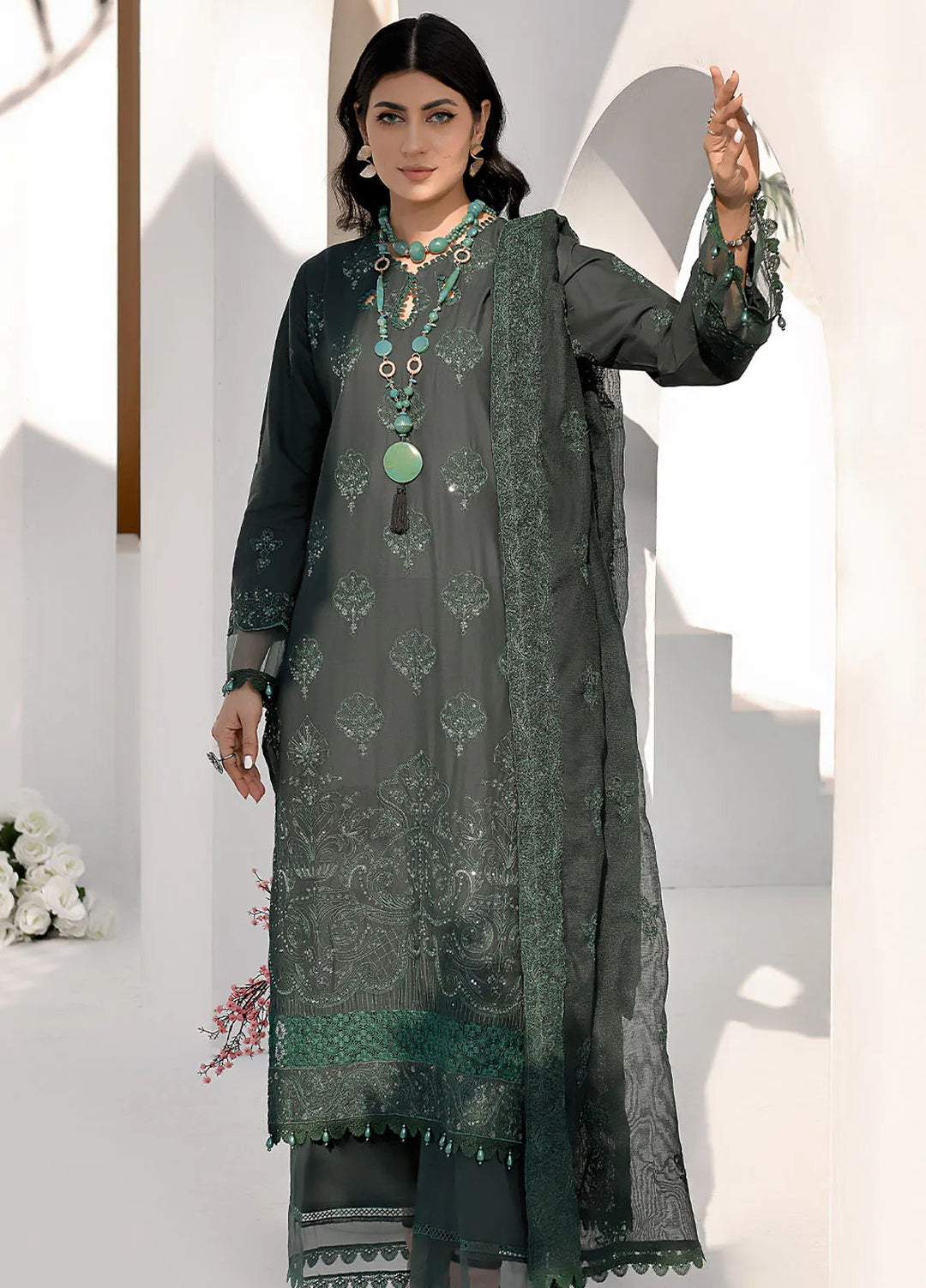 Mona Embroidery Luxury Pret Embroidered Chiffon 3 Piece Suit Dreamy Bloom-Mint-Green
