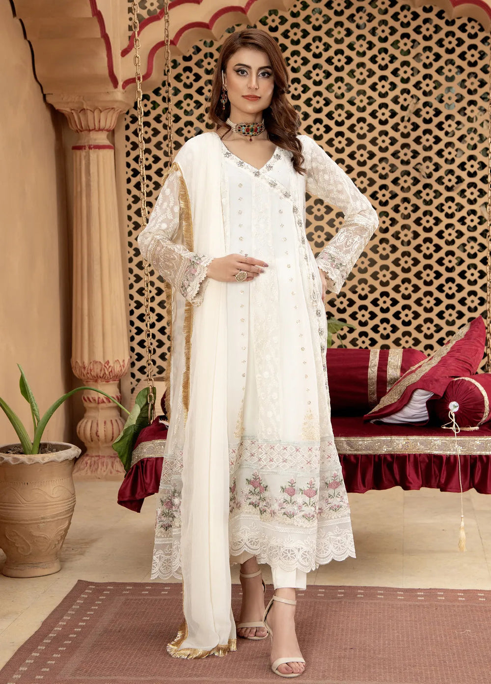 Mona Embroidery Pret Embroidered Chiffon 3 Piece Suit Divinedrape Angrakha-Off-White