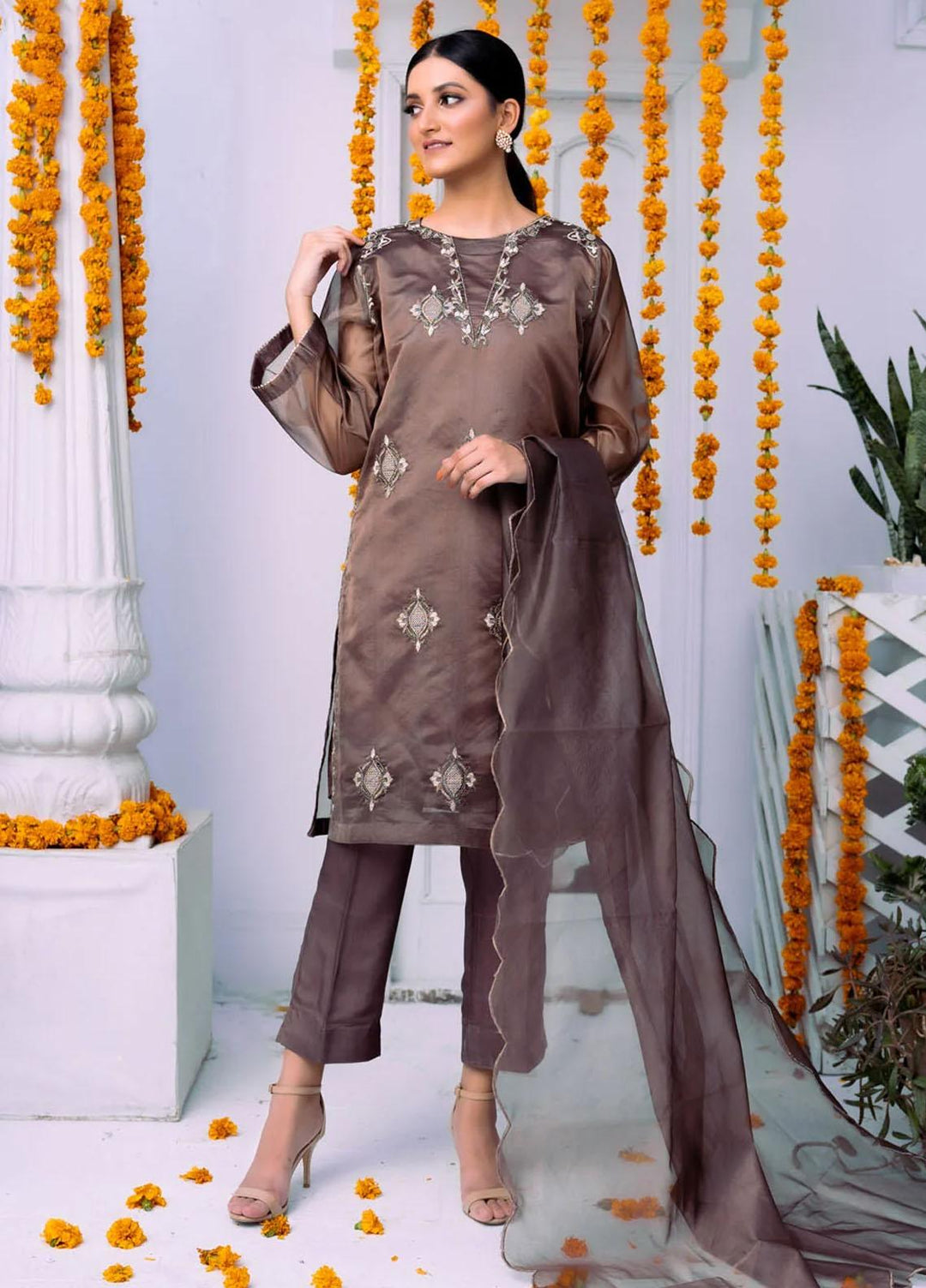 PSK Couture Pret Embroidered Tissue 4 Piece Suit COPPER HAZE