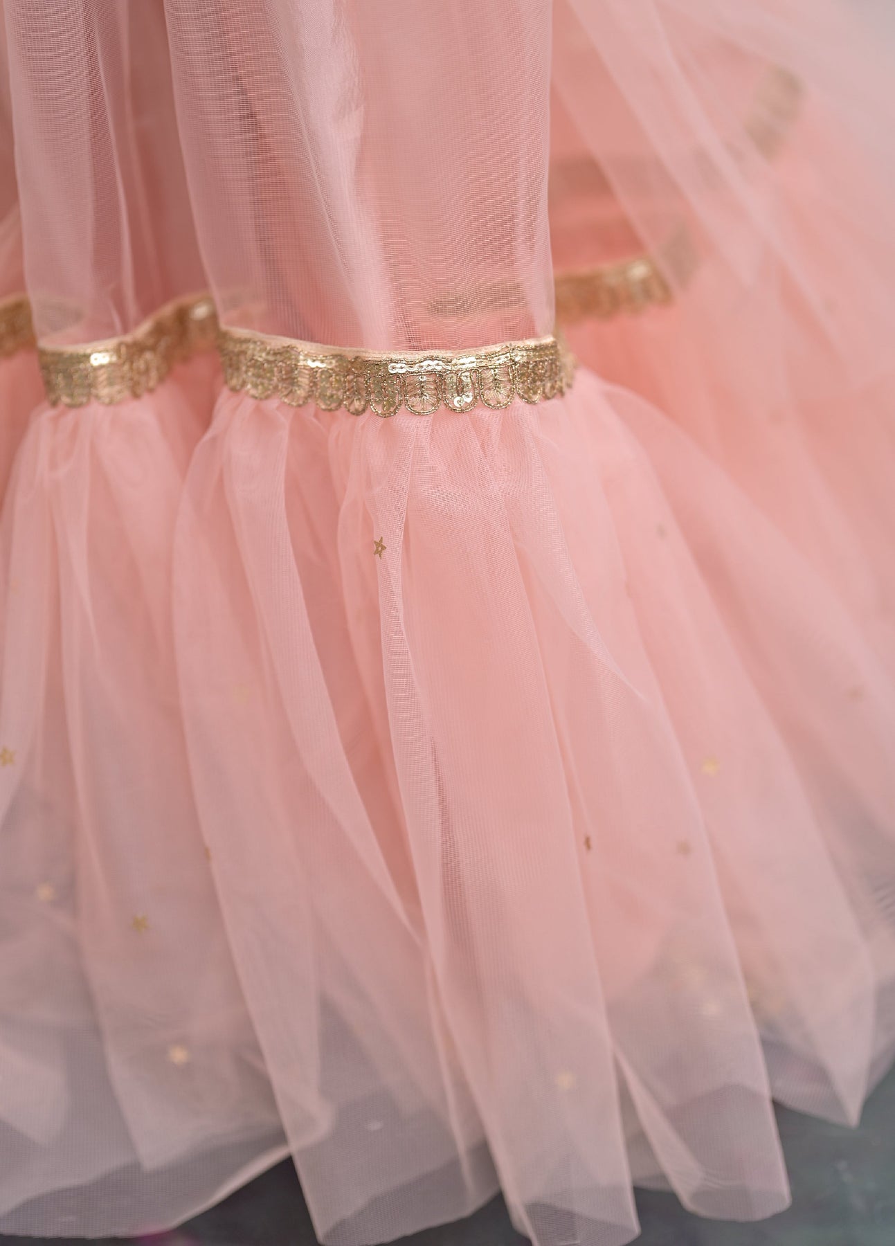 \nThe Blossom Queen Frock is perfect for a festive occasion or a special celebration, combining traditional beauty with modern details. The soft cotton net, elegant embroidery, and delicate embellishments create a harmonious balance of grace, sophistication, and playfulness, making this frock an ideal choice for a young queen on her special day.