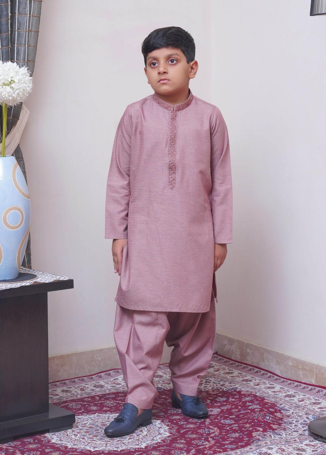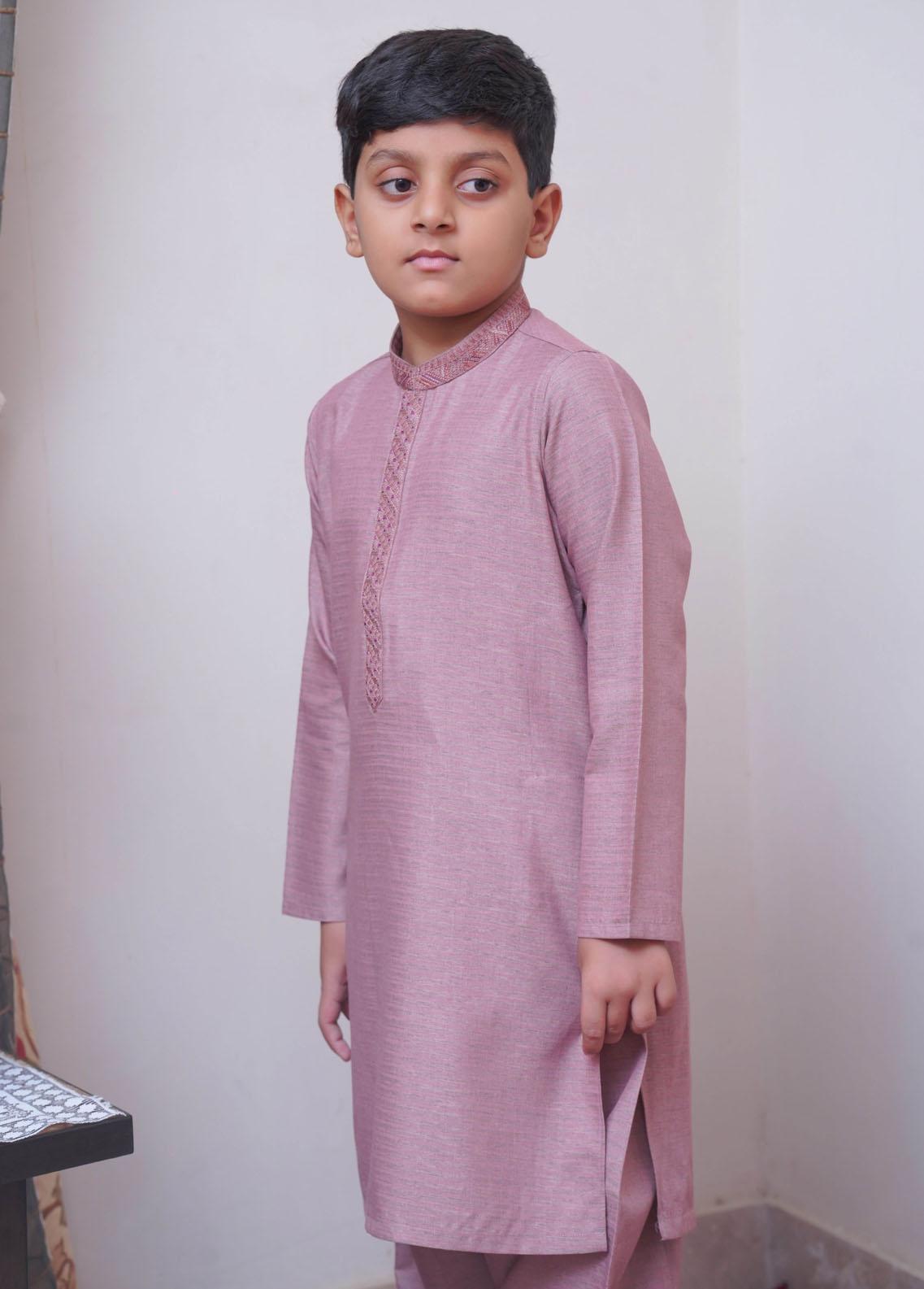 Formal Style Kameez Shalwar for Kids , Easy Iron ,Soft Fall Finish Fabric , with Geomatric Design rich embriodrey on the collar and the front placket