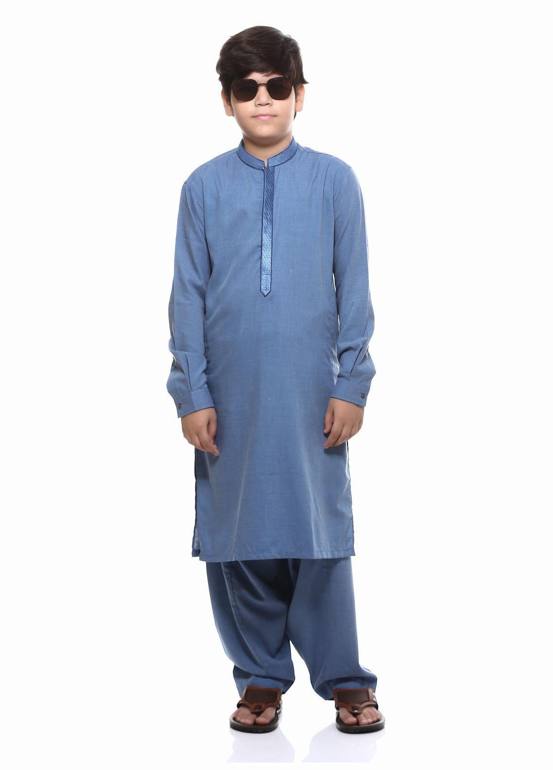 Formal Style Kameez Shalwar Suit for Kids , Easy Iron ,Soft Medium Fall Finish Fabric , with Geomatric Design rich embriodrey on the collar and the front placket