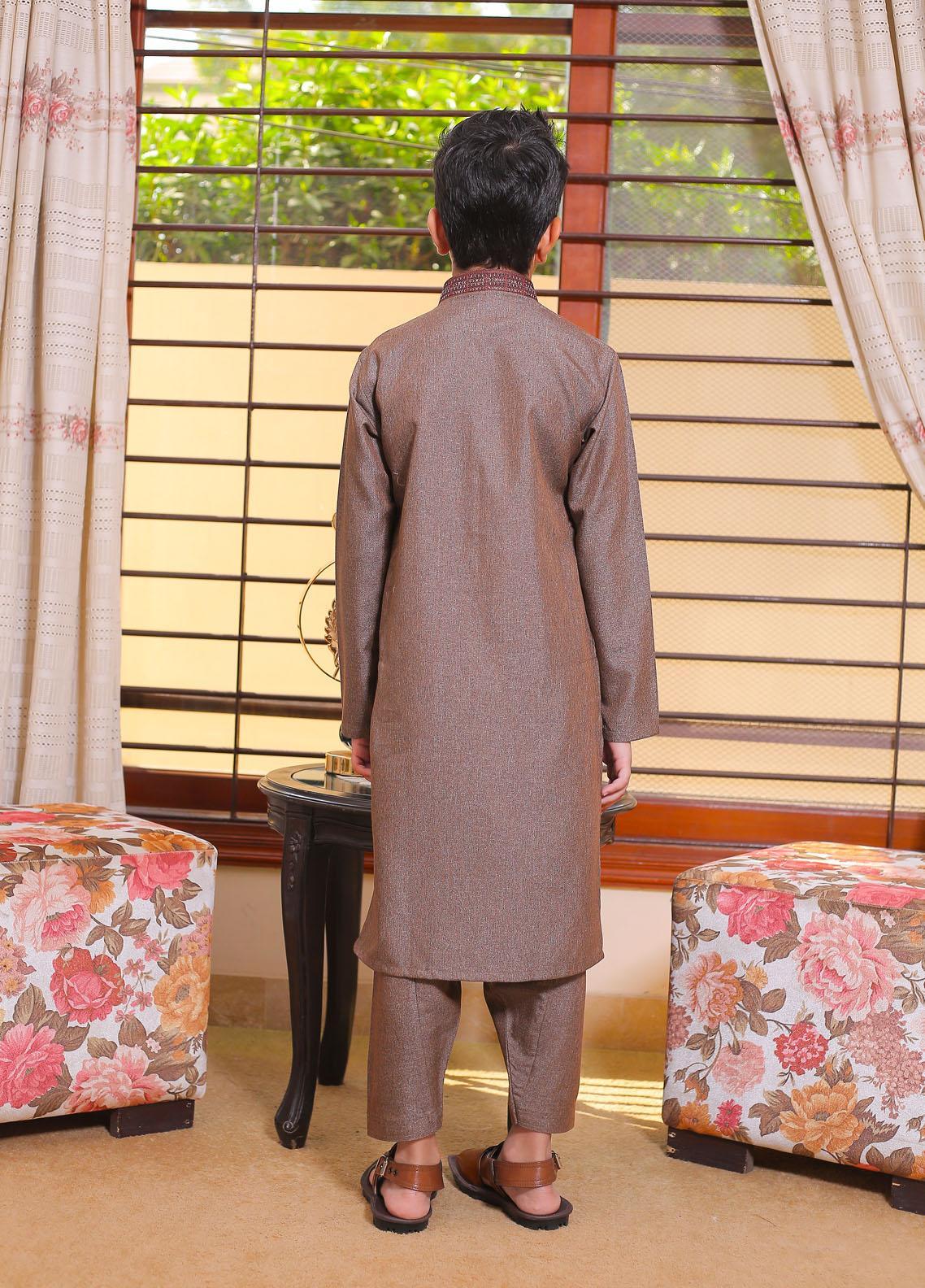 Formal Style Kameez Shalwar Suit for Kids , Easy Iron ,Soft Medium Fall Finish Fabric , Self Designed Yarn Dyed Fabric with rich embriodrey on the collar and the front placket