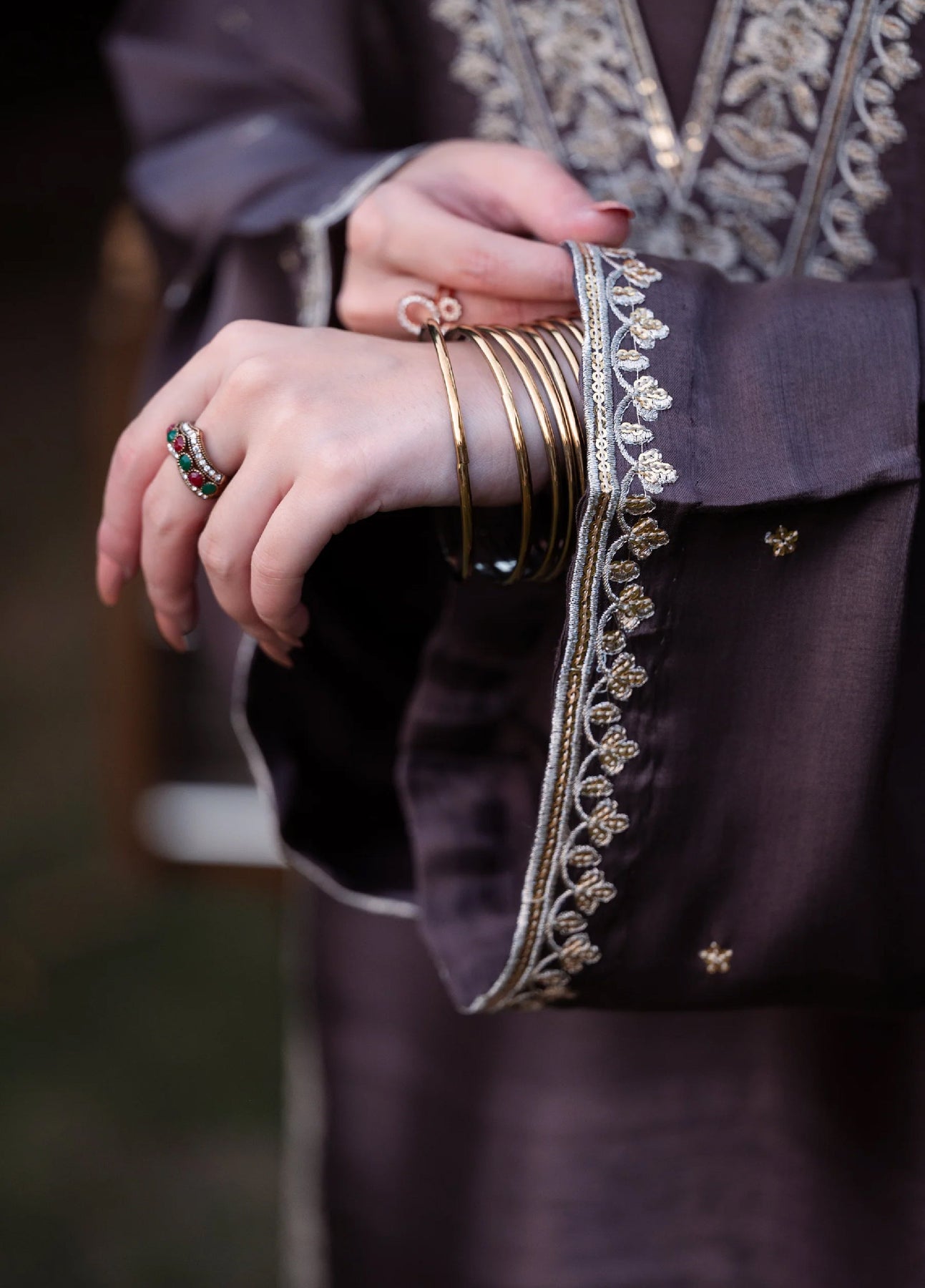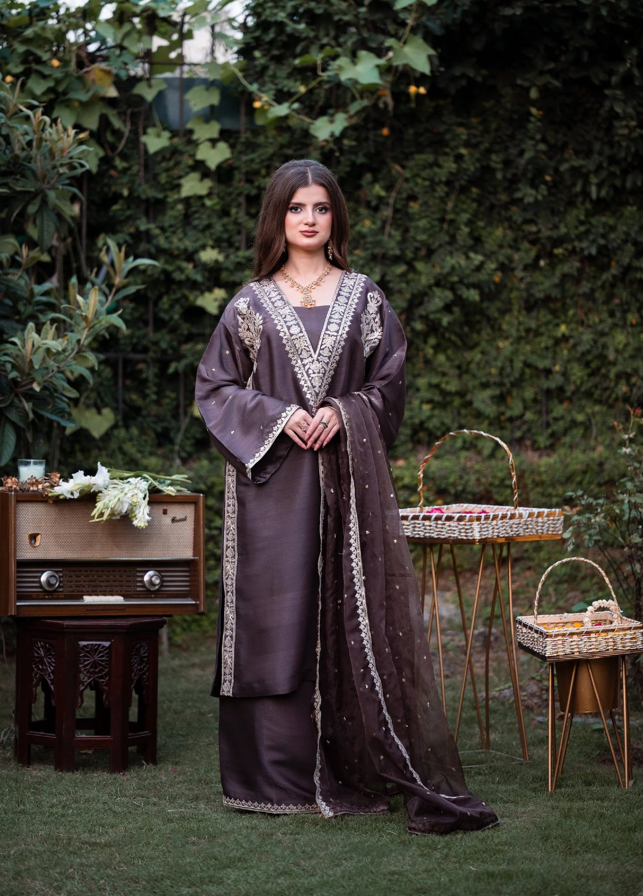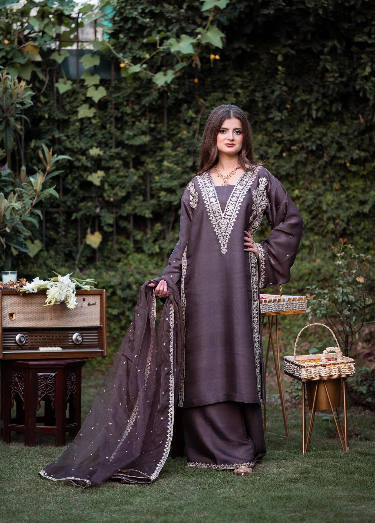 An exquisite deep brown lama silk ensemble adorned with delicate tilla and sequin embroidery along the neckline and borders. The outfit’s subtle sheen and intricate detailing lend it a refined, timeless charm. Paired with a matching organza dupatta embellished with scattered sequins and a finely finished border, it’s the perfect blend of understated luxury and classic grace.
