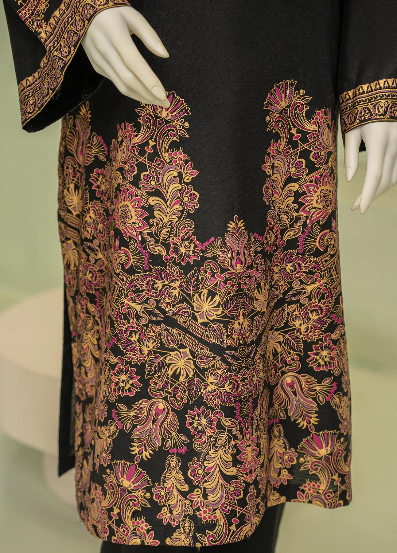A black co-ord set featuring a straight kurta with intricate gold screen print at the daman of the shirt. Paired with tailored straight trousers, this look exudes minimal elegance with a touch of artistic detail.
