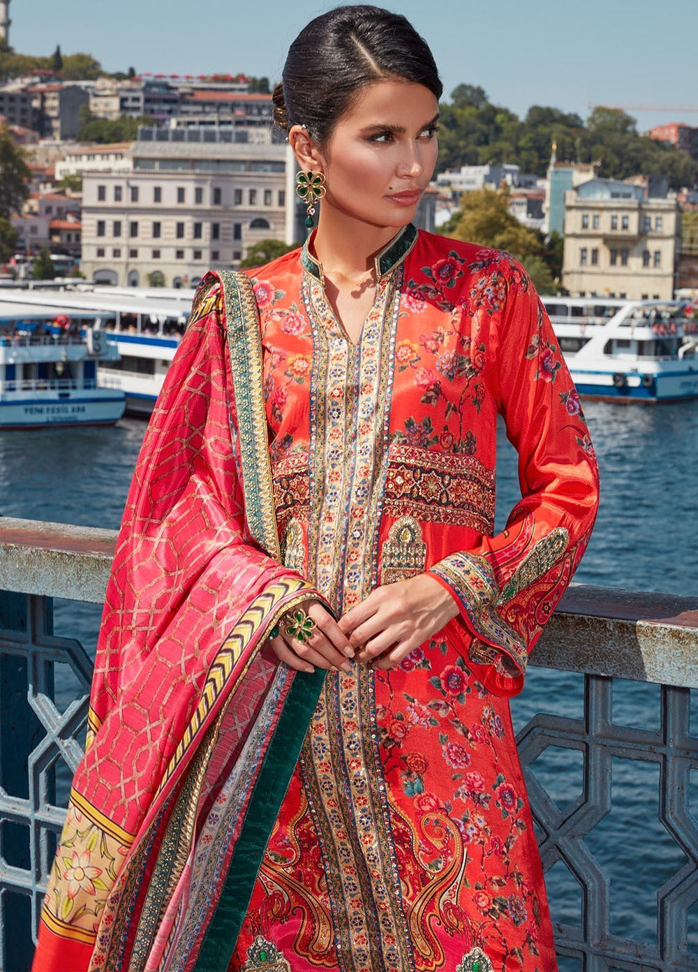Wear this one of a kind ensemble inspired by Ottoman design and cut with beautiful detailing in emerald green hand worked motifs and gold on an Orient flame coloured shirt. Coupled with matching pants and a finely crafted dupatta to complete this stunning look