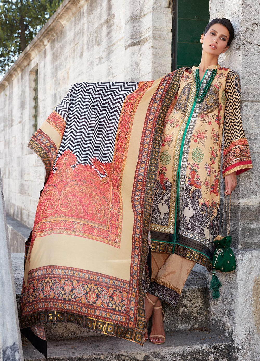 An orient inspired piece of art breathes understated regality in shades of vibrant orange, green and cream with vivid magenta daman. Featuring organza embroidered borders, gota and golden lace along with tila and sitara hand work. Finished with a fabulous contrasting dupatta and raven pants