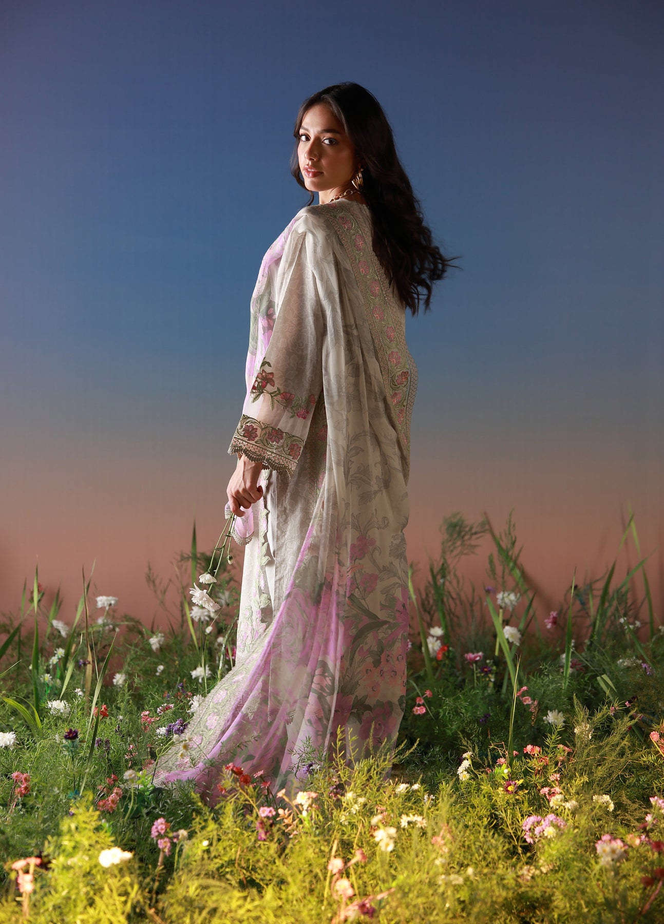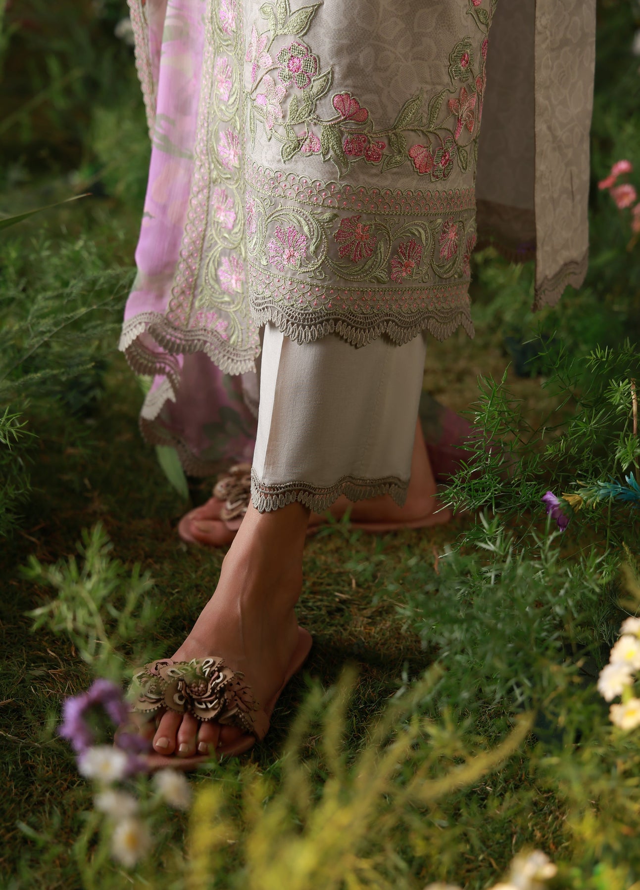 Step into understated luxury with this exquisitely embroidered ensemble, crafted in a soft neutral palette and adorned with delicate pastel french florals. The intricate neckline embroidery and a wide statement sleeves add a graceful charm, while the printed and embroidered silk dupatta in contrasting magenta and green hues complete the look with timeless elegance.