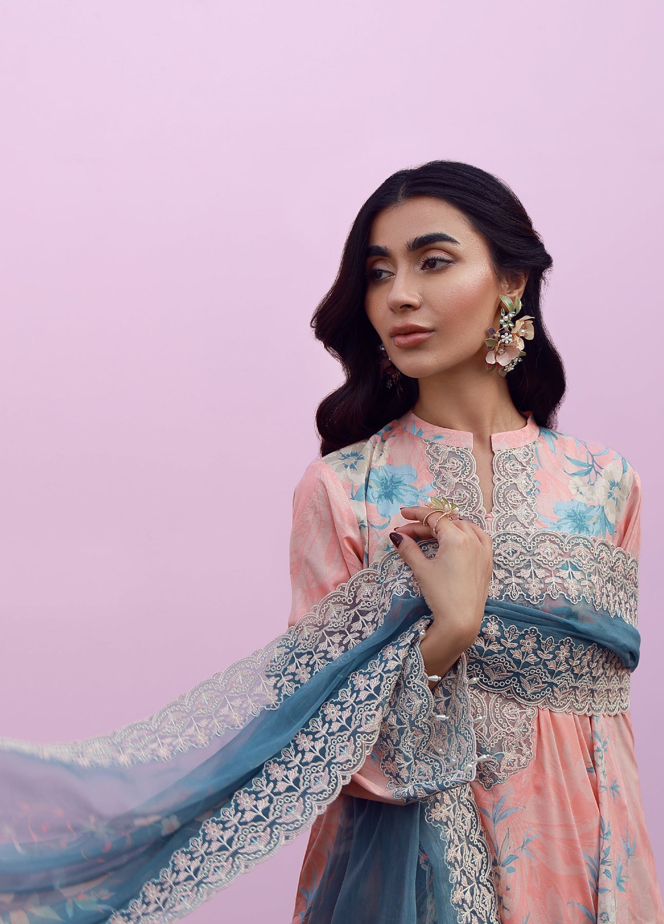 A fresh expression of everyday elegance, this outfit features a soft pastel peach base adorned with delicate floral prints in refreshing hues. Intricate lace embroidery along the neckline and sleeves adds a refined touch, while the contrasting blue-grey silk printed dupatta with embroidered borders completes the look with effortless elegance.