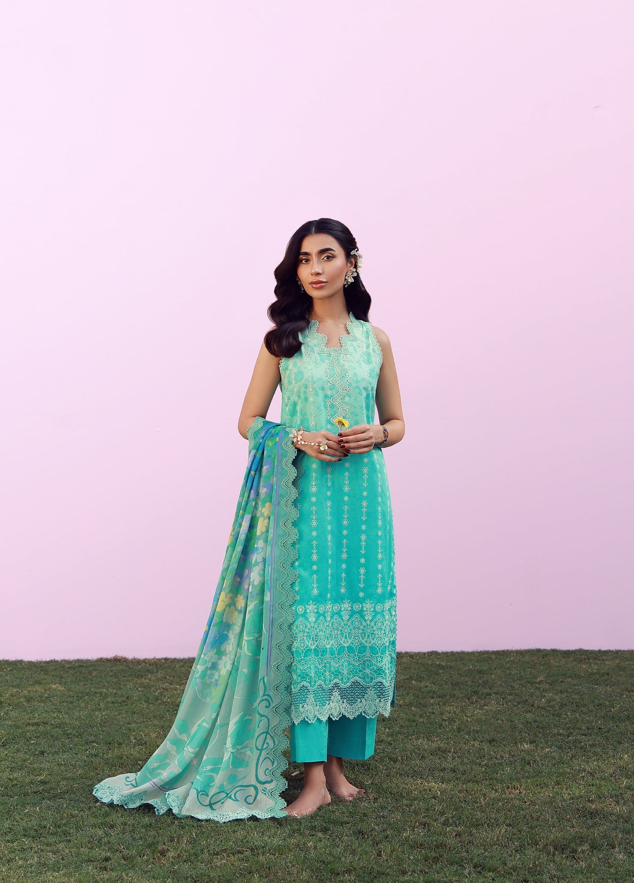 This graceful ensemble is rendered in a refreshing turquoise and pastel hues, adorned with delicate floral inspired eyelet embroidery on overall fabric and sleeves and finished with intricate floral lace detailing. The sleeveless silhouette offers effortless comfort, while the coordinated trousers and softly printed silk dupatta add a refined, airy finish.