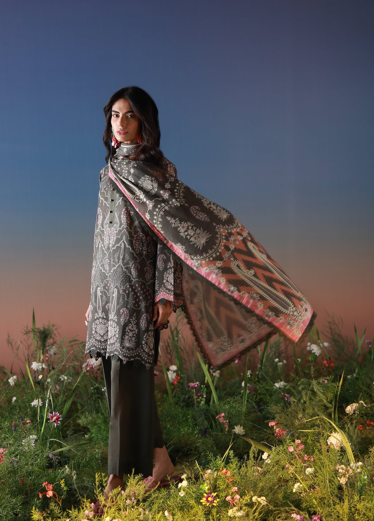Depp green base layered with intricate ivory motifs for a refined, almost monochrome look. The printed dupatta adds texture and flow, styled with sleek pants. Sophisticated, calm, and contemporary.