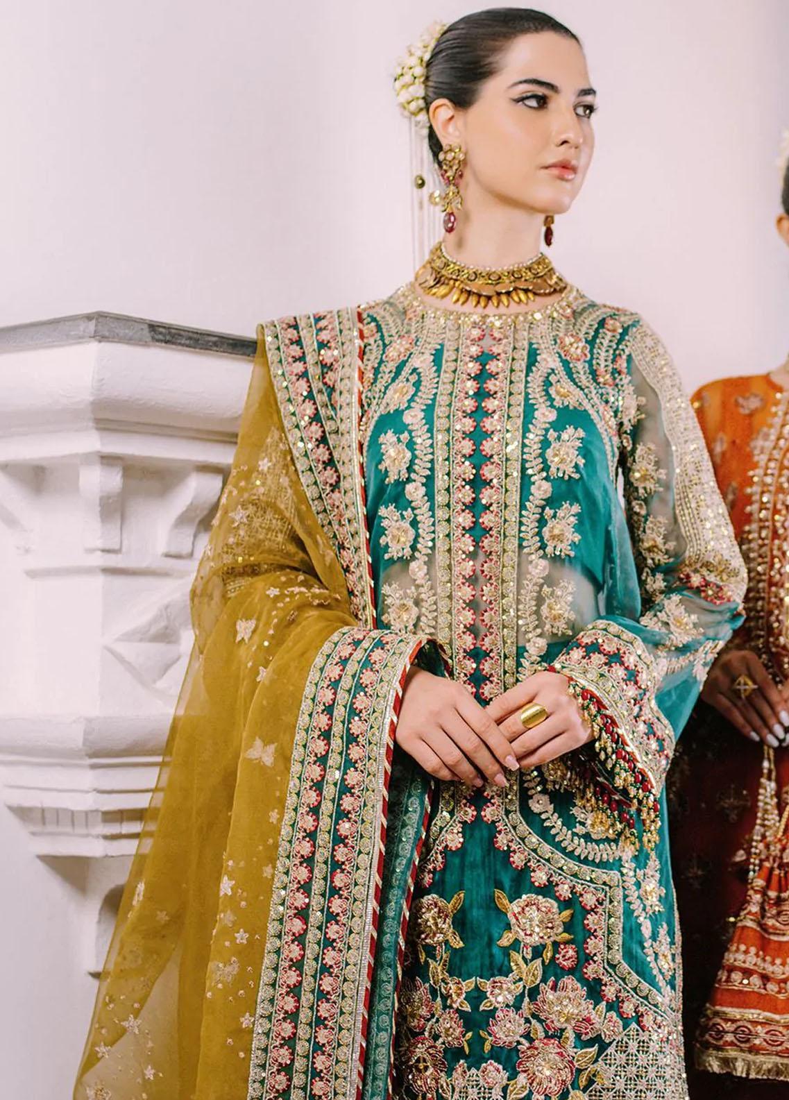 This Gharara Kurta set. Multi head and hand embellished, exemplifies craft, culture and creativity. The rich art of the emerald green tone silhouette pays homage to Sindhs architecture. Finely tailored kurta and embroidered dupatta falls in the lap of luxury, while gotta patti, tilla and sequins embroidery express the epitome of bridal elegance.